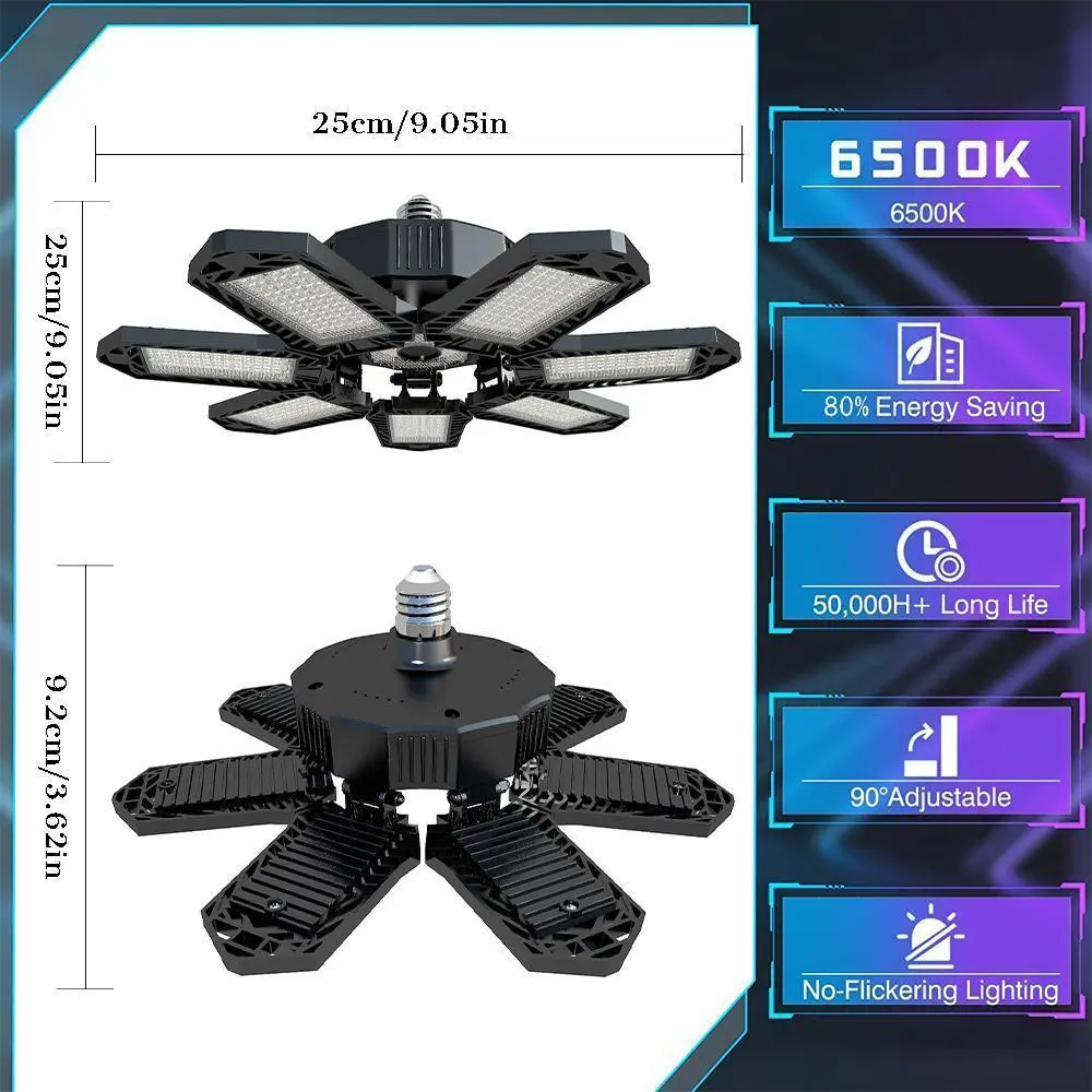 Flexible & Unique Design: Each of the six LED panels can be adjusted to fold up to 90° so that you can adjust garage light and easily illuminate various dark corners; this will make the light cover 360° area.