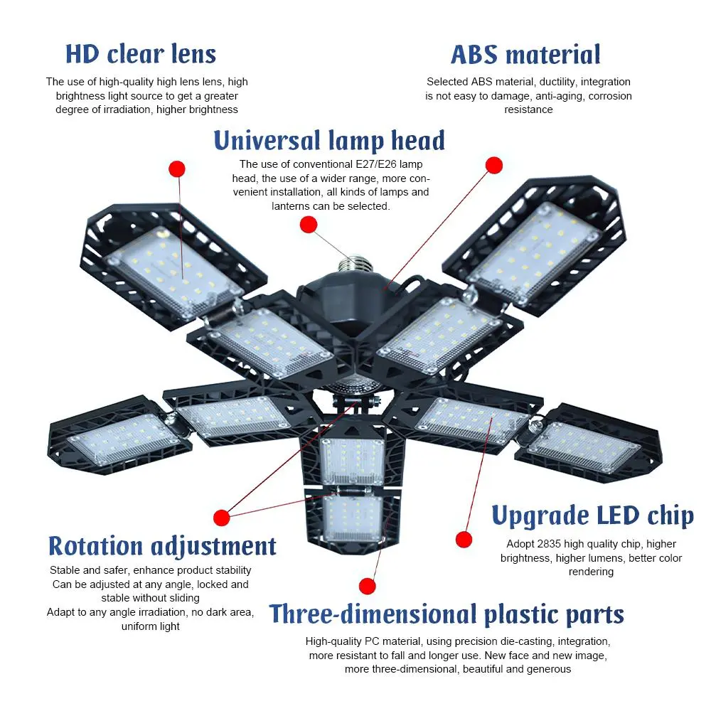 Adjustable LED Ceiling Light Fixtures. Unique deformative wide-angle ultra-bright garage light, 5 lighting panels can be adjusted 90 degrees, the lighting angle can be adjusted with 360° stable lighting in all directions.