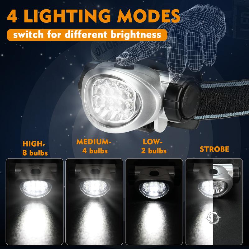 ·4 Lighting Modes. Your brand new LED headlamps allow you to choose between 4 different levels of light. Conveniently pick 2 bulbs, 4 bulbs or 8 bulbs brightness levels while out hiking, exercising or walking your dog. Also comes with a strobe light mode that can protect you against unwanted attackers to disorientate them while you get away