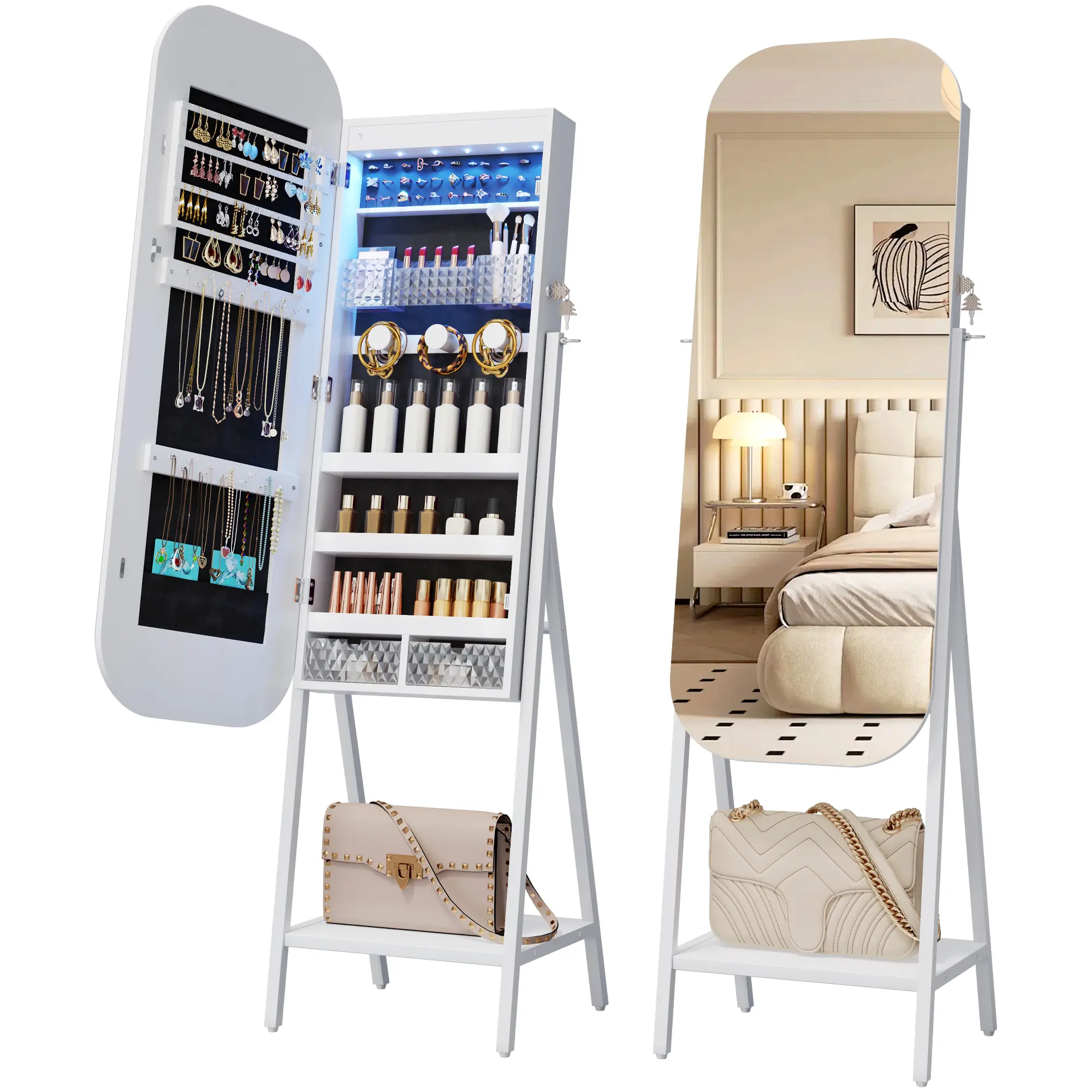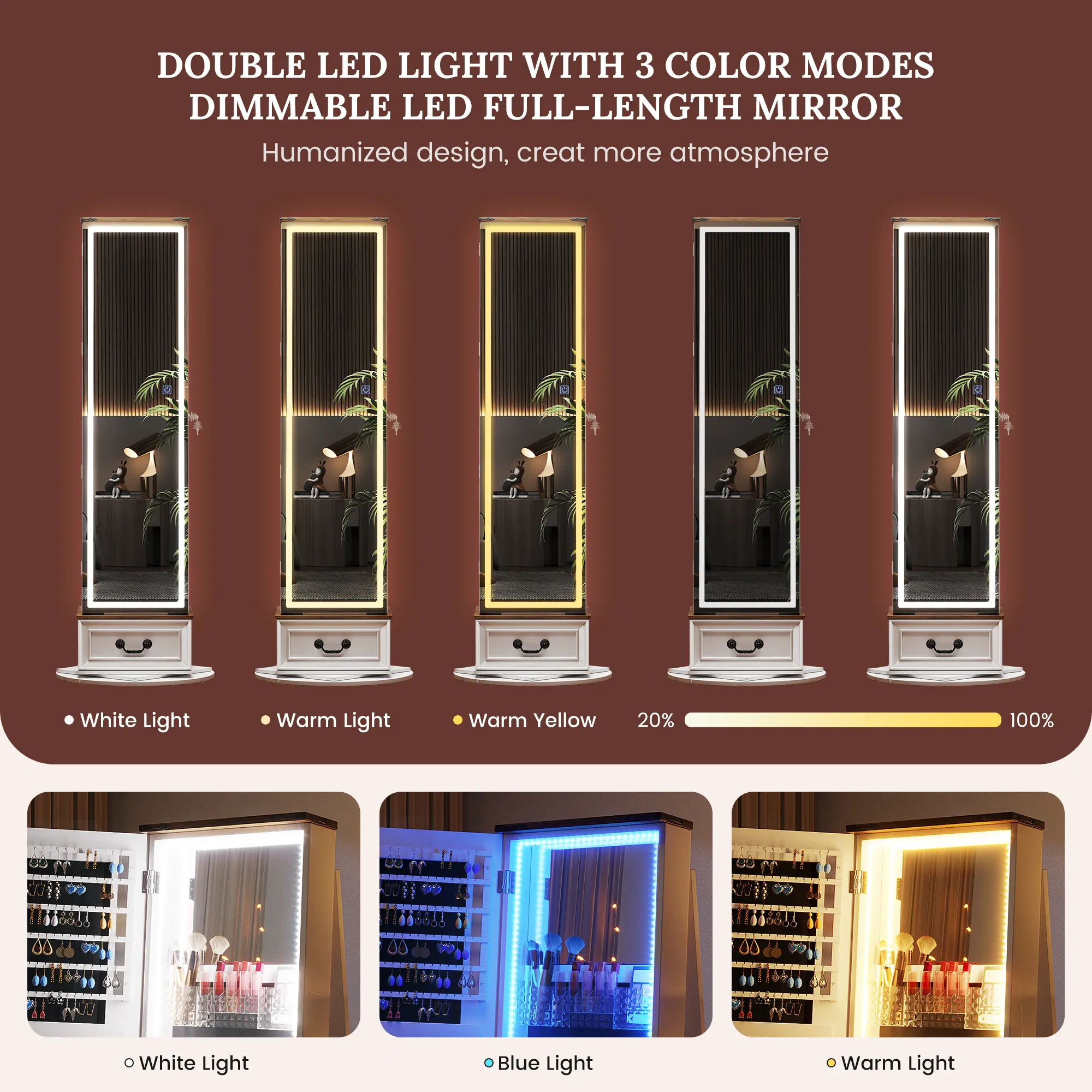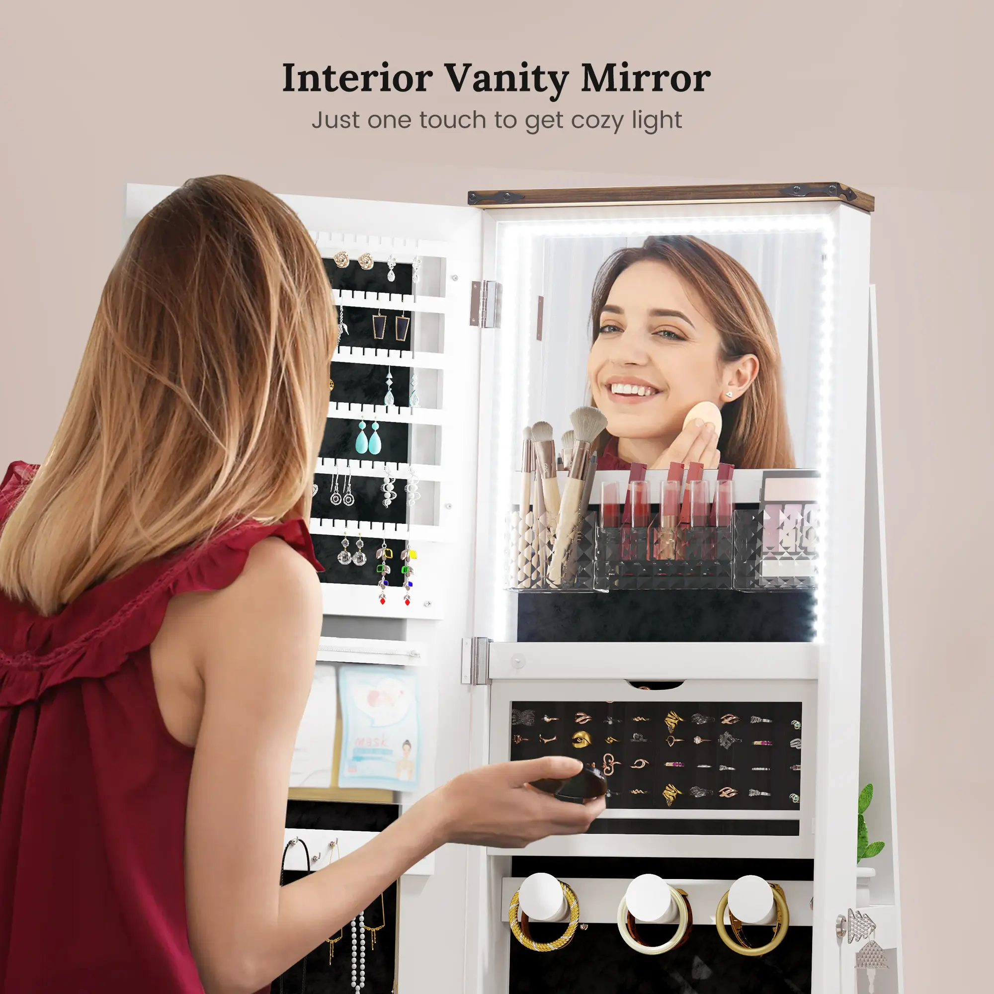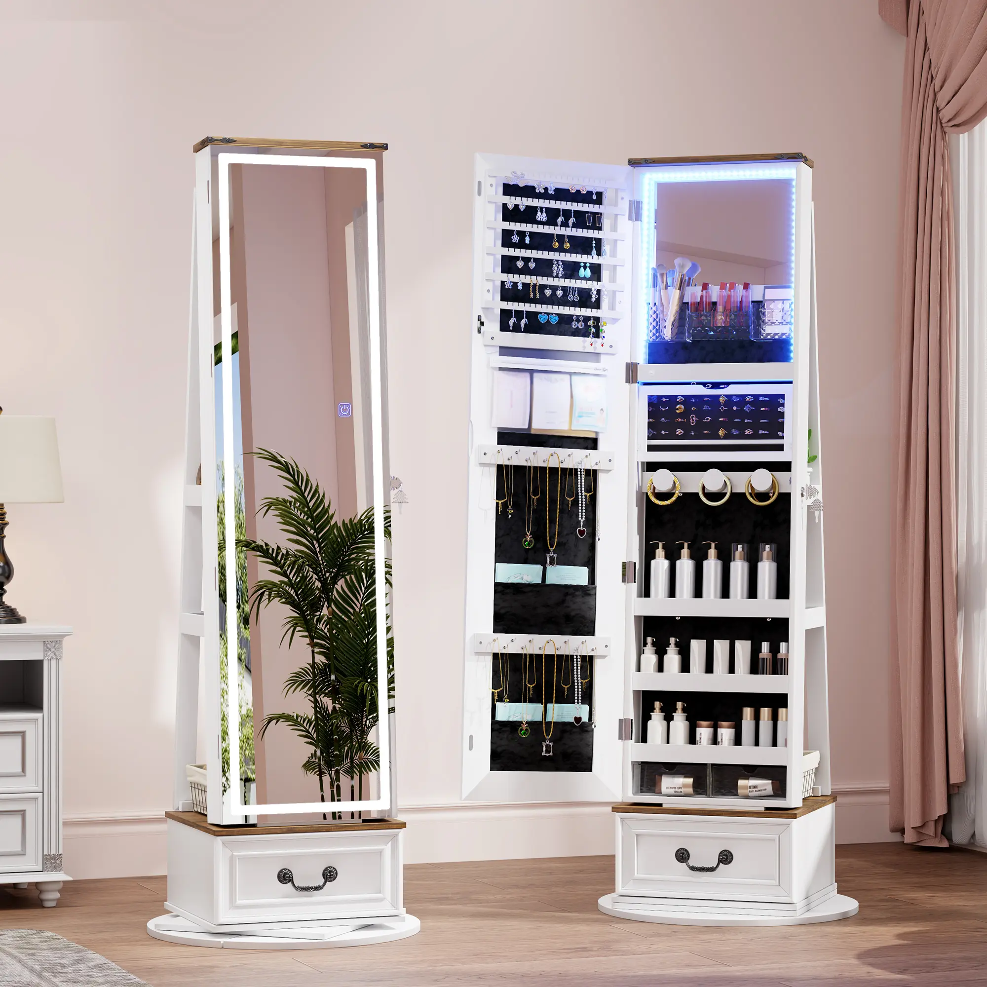 The cabinet’s top mirror rotates smoothly, offering 360° access to your jewelry and cosmetics. Integrated with three adjustable LED light modes (white, warm, and blue), the mirror provides optimal lighting for makeup application or jewelry selection, blending functionality with modern elegance.
