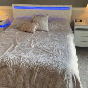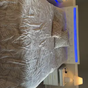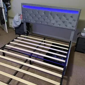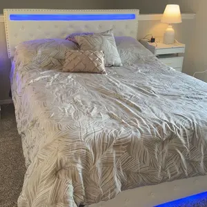 Smart RGB LED Bed Frame with Music Sync: Built-in RGB LED lights in the upholstered headboard allow you to customize colors, brightness, and lighting modes via mobile APP or remote control. Music Sync mode creates an immersive atmosphere for relaxing, gaming, or winding down at night.