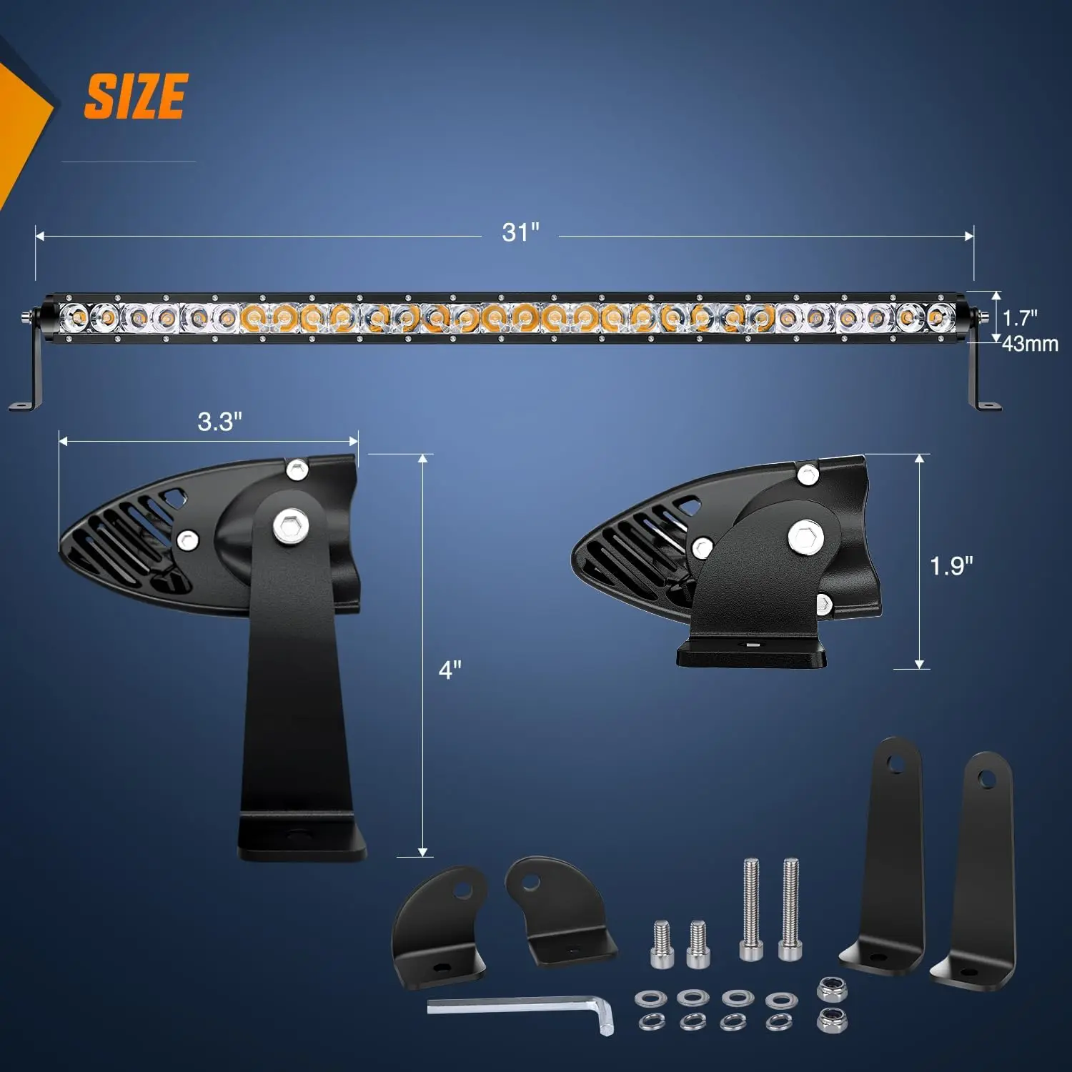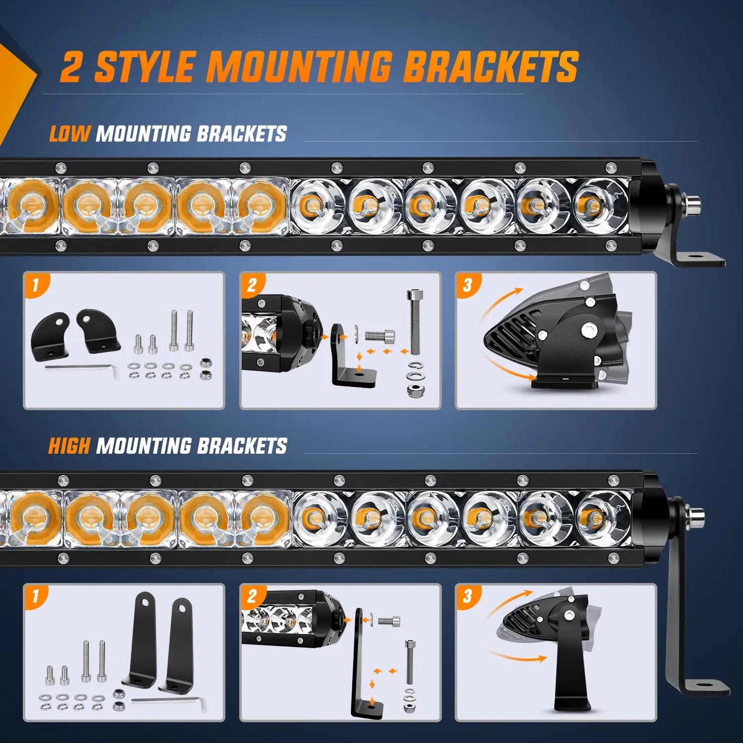 Including high and low brackets sets to adjust the height,Reasonable design makes the light bar get fixed firmly to resist shock and other conditions.