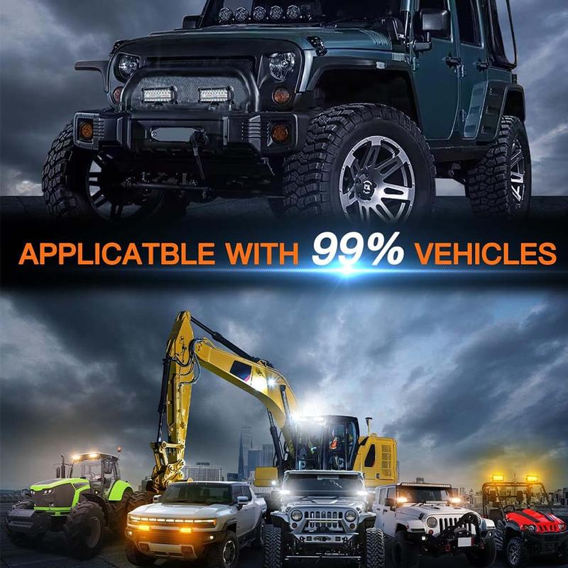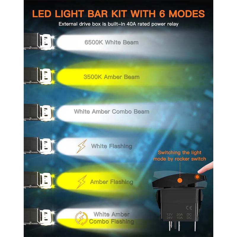 The LEDMIRCY LED light bar allows stable switching between 6 lighting modes: white, amber, white/amber, white/flashing, amber/flashing, and white/amber/strobe. White light enhances night visibility, amber helps in foggy conditions, and strobe provides a warning (SOS) effect. No more uncertainty on your journey, only bright, clear lighting.