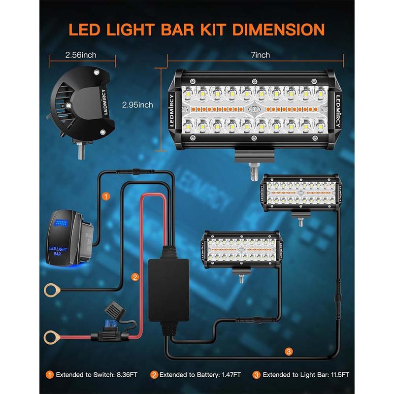 The 7-inch LED light bar kit fits DC 9-30V vehicles, including trucks, boats, SUVs, ATVs, UTVs, RZRs, and motorcycles. The package includes 2PCS 7-inch light bars, a rocker switch wiring harness, adjustable brackets, screws, hardware, and spade connectors. Contact us for any assistance—we'll respond within hours.
