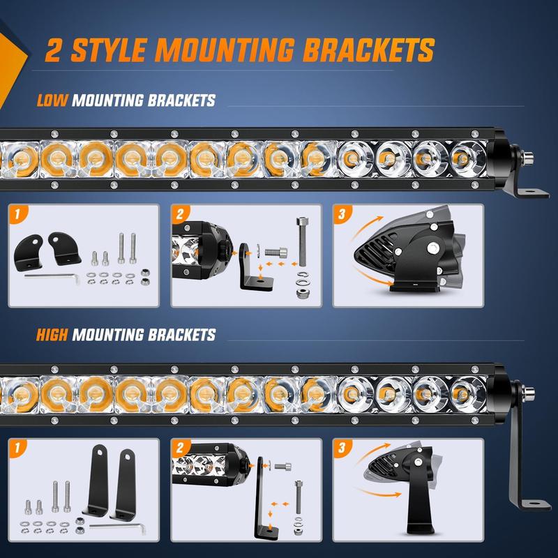 Including high and low brackets sets to adjust the height,Reasonable design makes the light bar get fixed firmly to resist shock and other conditions.