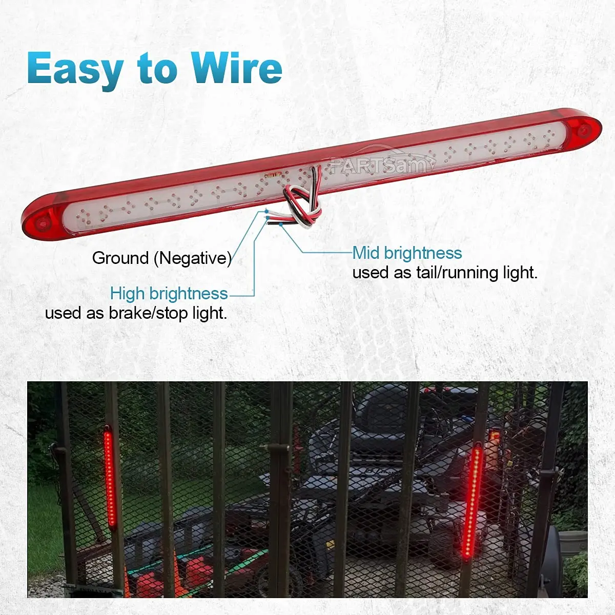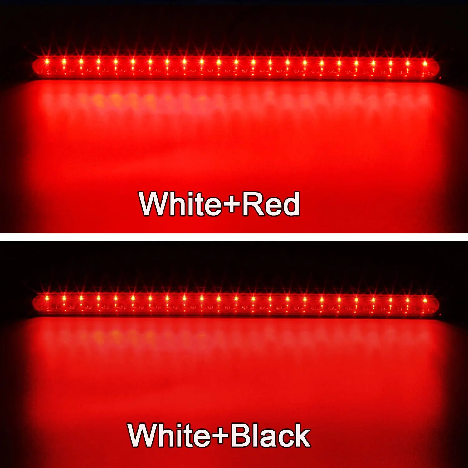 ·Each 17 inch red light bar is powered by 23 high power Super FLUX LED for a bright performance. This red led strip lights 12v is HARDWIRED with three wire pigtails: white is ground wire, Black is the low brightness as tail lights or running lights, Red is the high brightness as stop turn brake lights;