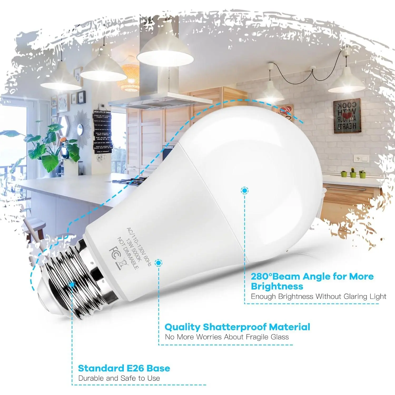 Upgrade 160 degree to 280 degree flood beam angle, our A19 led light bulbs provides more diffused and uniform lighting, ideal for everyday life no matter where they are, including living room, kitchen, bedroom, bathroom, dinning room, study, garage and even office.