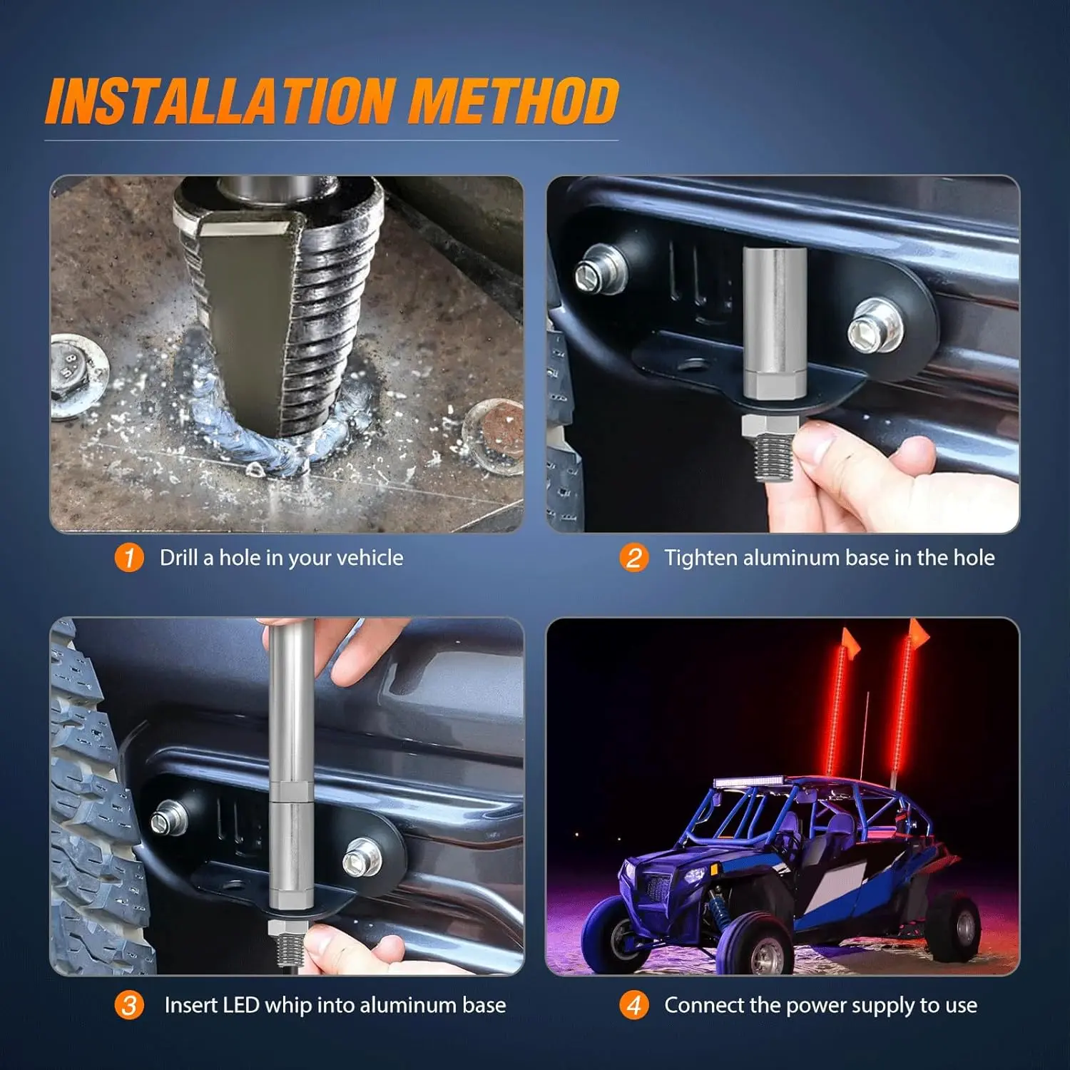 Illuminated whip tube made of polycarbonate. High quality 5050 LEDs are used for high brightness output.
