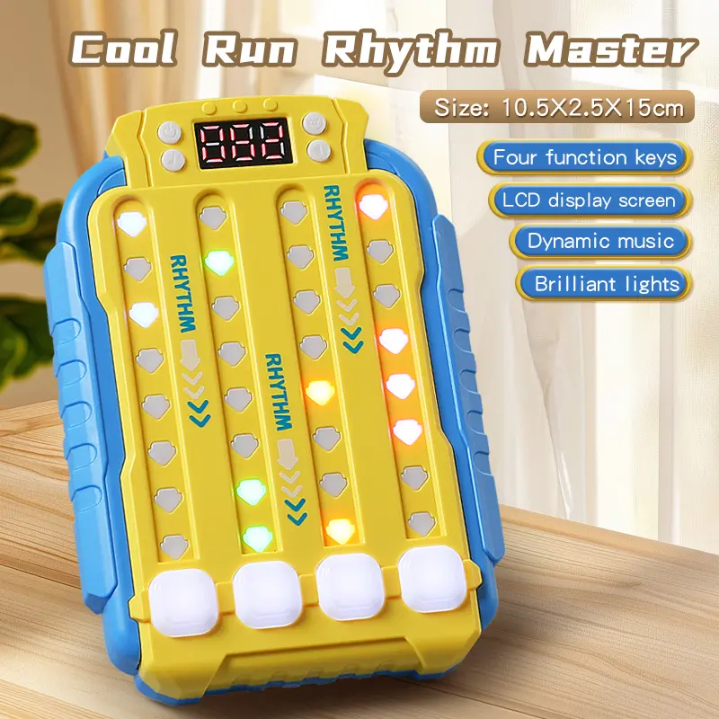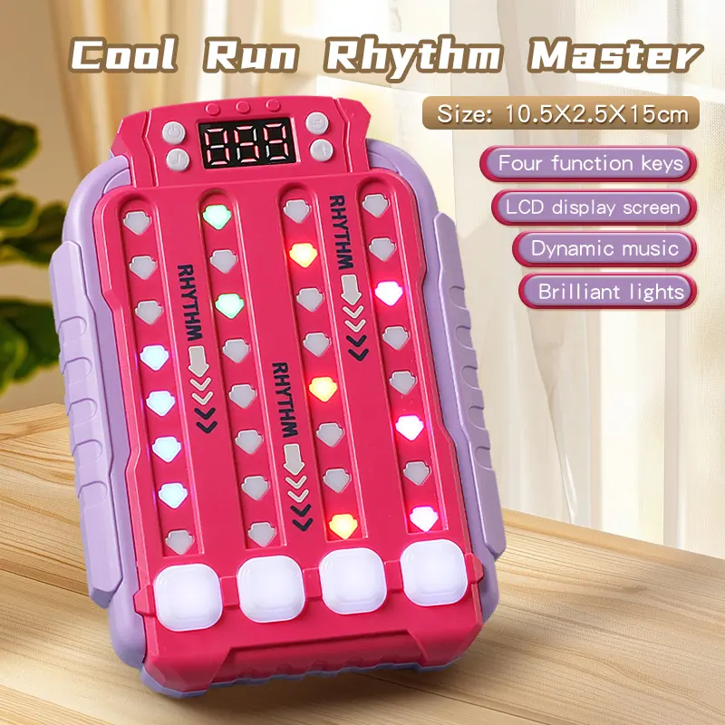 Features vibrant LED lights and musical accompaniment, where players need to press buttons quickly in sync with the changing lights, providing a fun memory and reaction challenge.