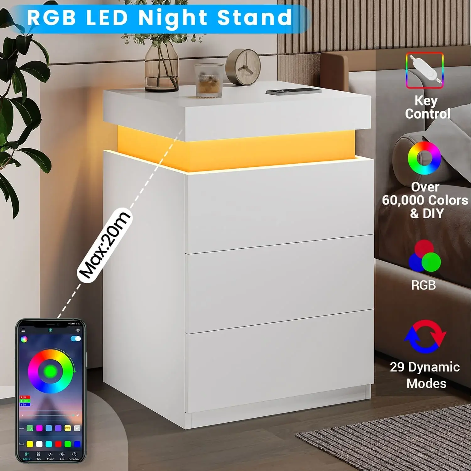 🌟 Nightstand with LED Lights Charging Station White Modern Accent Tables 🌟