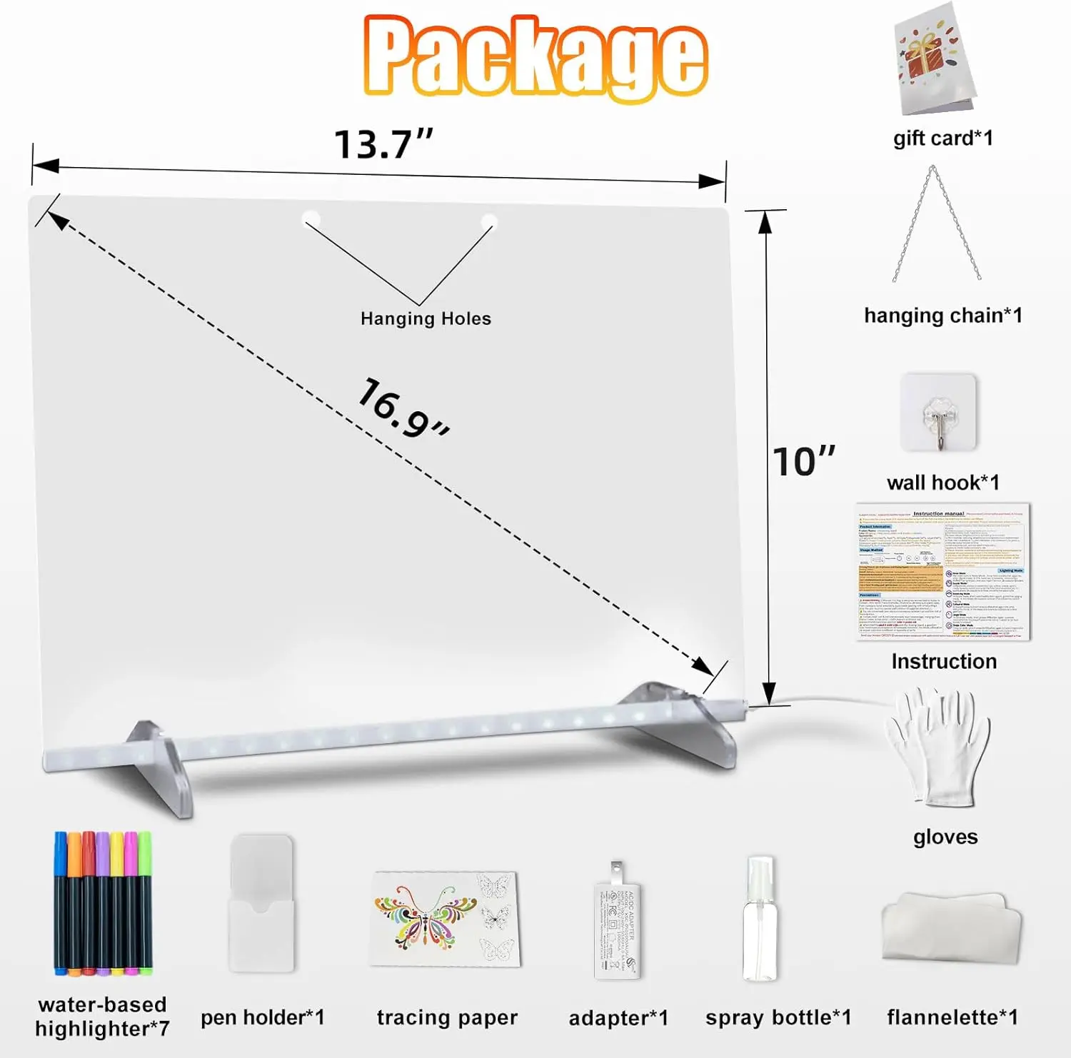 ·Complete Accessories: The acrylic dry erase board with light includes 2 invisible stands for stable setup, 1 reliable adapter for stable power supply, 1 wider soft cleaning cloth and spray bottle for easy maintenance, and 1 hanging kit with hooks and durable chain, 7 vibrant pens deliver rich, eye-catching colors for creative artwork.Magnetic pen holder keeps pens organized and within easy reach.Included tracing book inspires kids to draw and practice with ease.Giving you everything you need for seamless use and versatility.