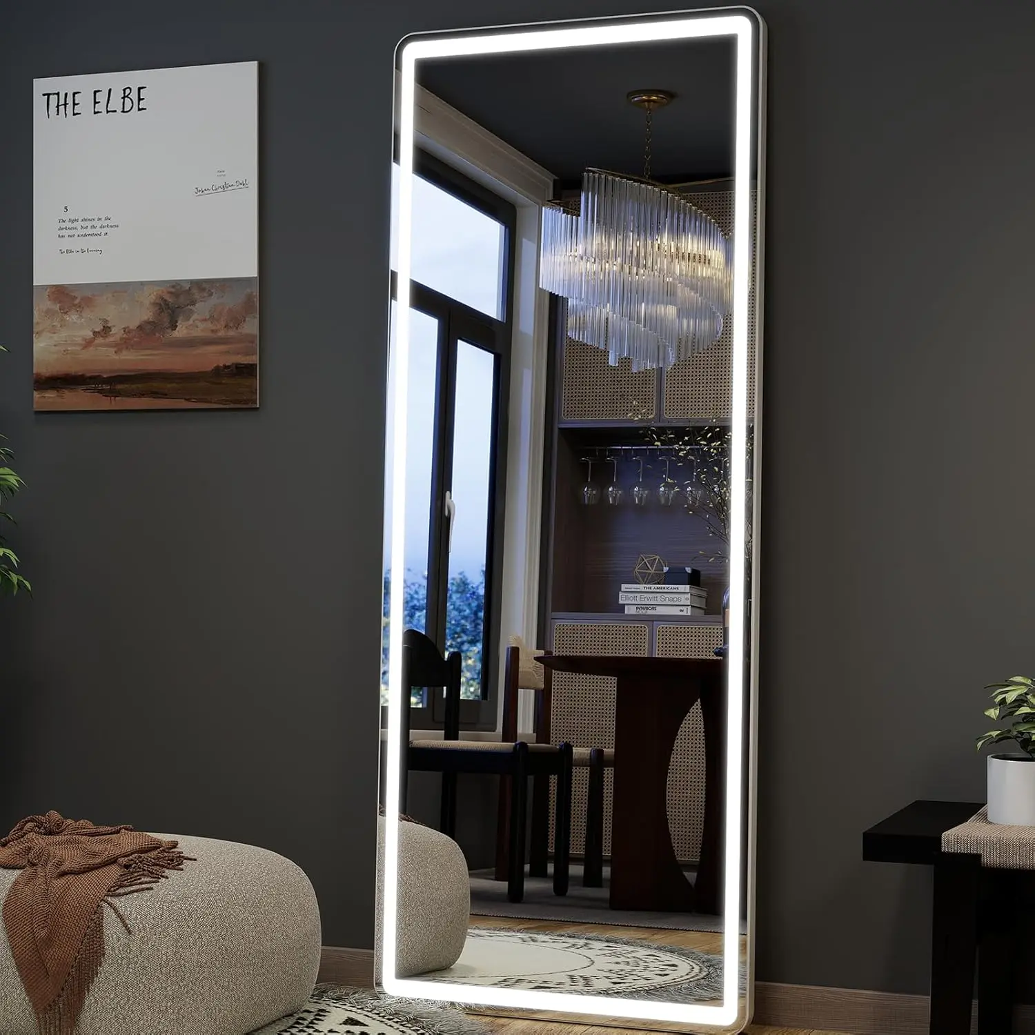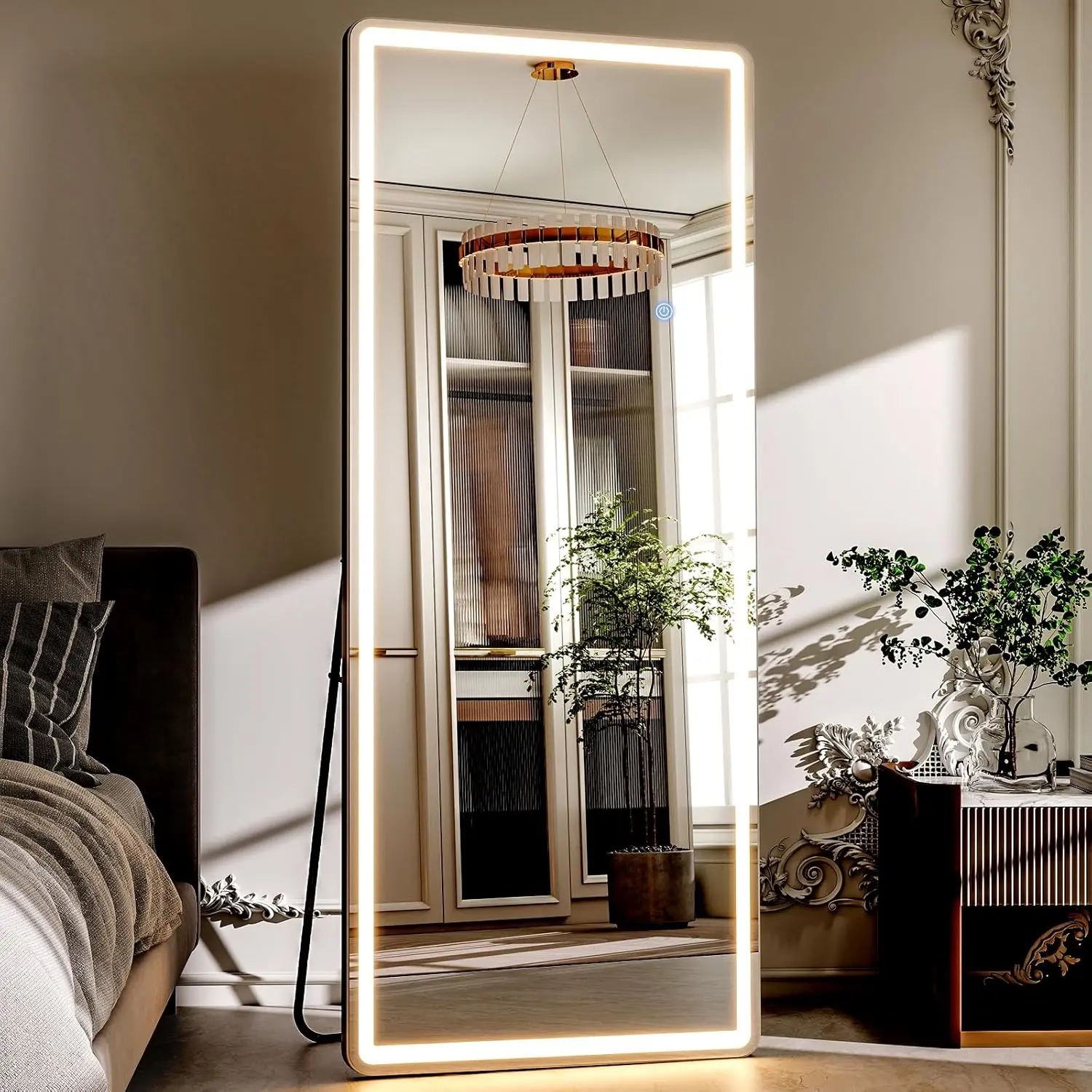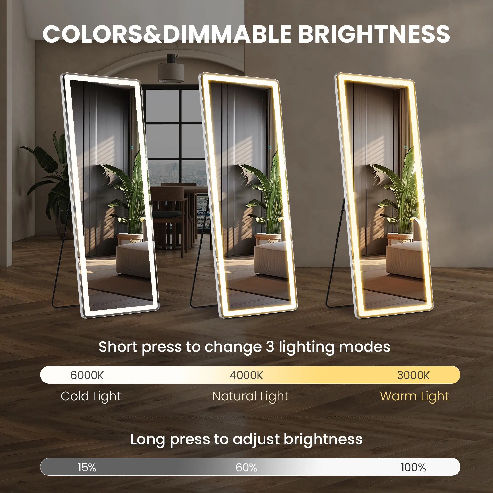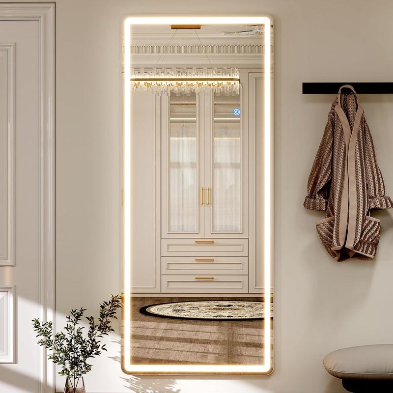 【Dimmable & 3 Color Temperature】This lighted full length mirror is multifunctional. You can press the button to change the color temperatures: Warm(3000K), natural (4000K) and cold(6000K). You can also dim the brightness to your comfortable level. All these will be easily controlled by the touch button