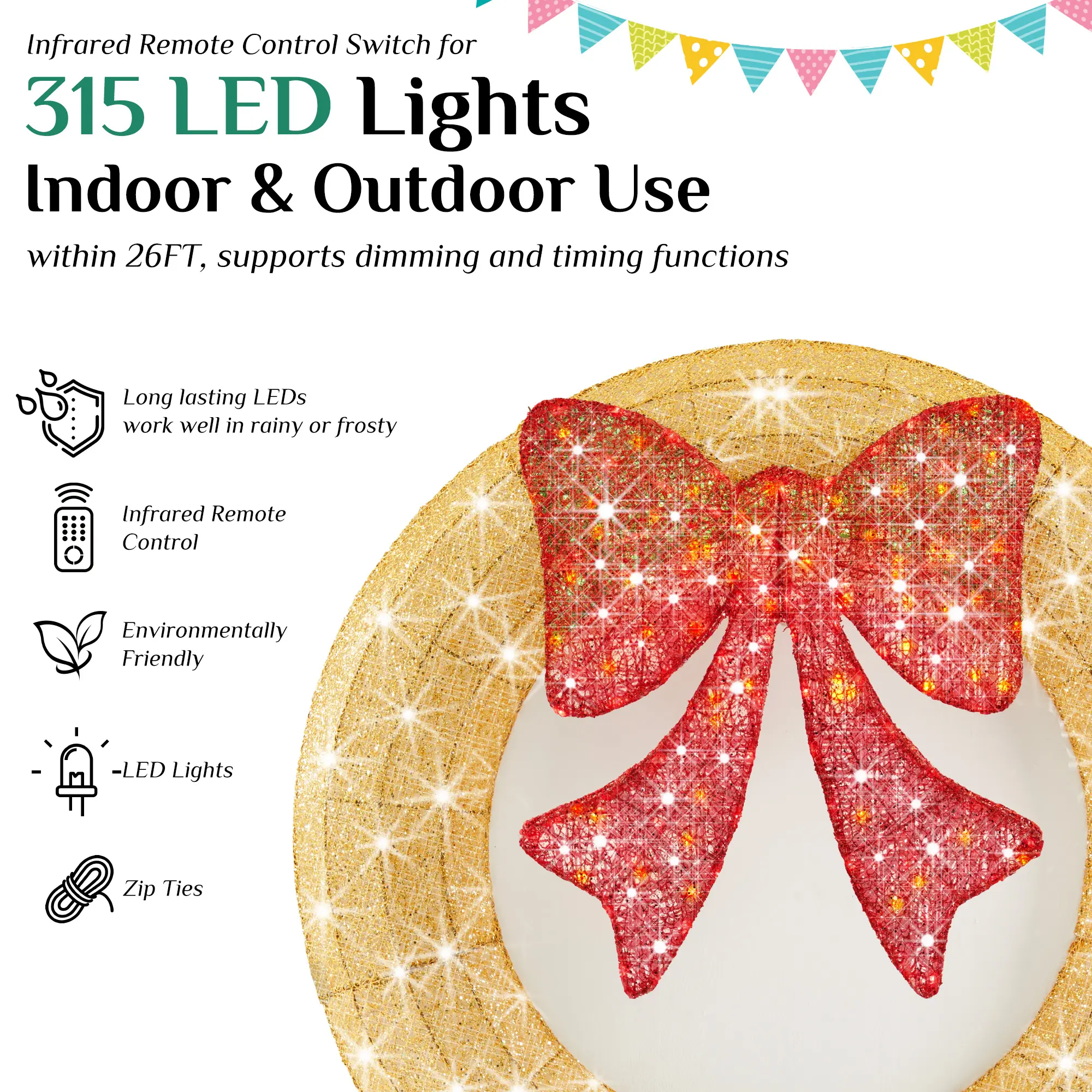 ·【Bright & Energy-Efficient LED Lights】Pre-strung with 120 colorful LED lights, this wreath shines bright all season long while staying cool to the touch. Energy-saving LEDs use less power, so you can enjoy the glow without worrying about high electricity bills.