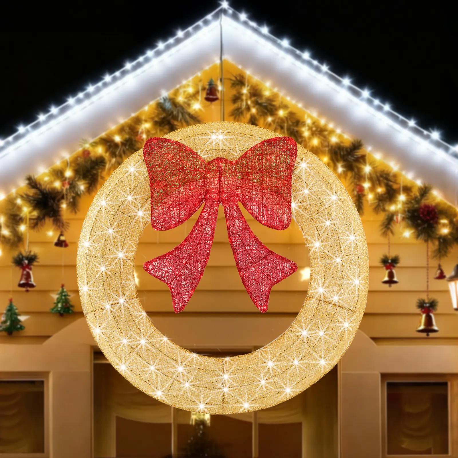 ·【Durable All-Weather Design】Crafted with a sturdy wire frame and covered in glittery, weather-resistant fabric, this wreath is built to withstand rain, snow, and wind—keeping its beauty intact throughout the holiday season.
