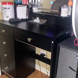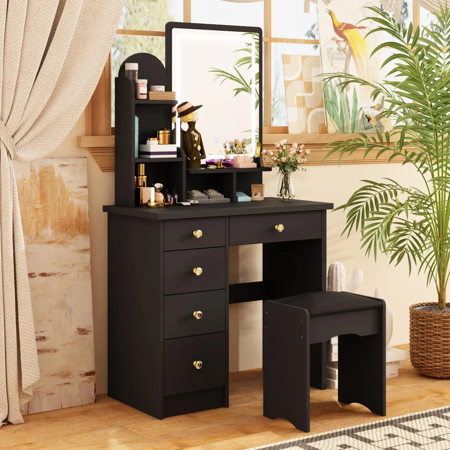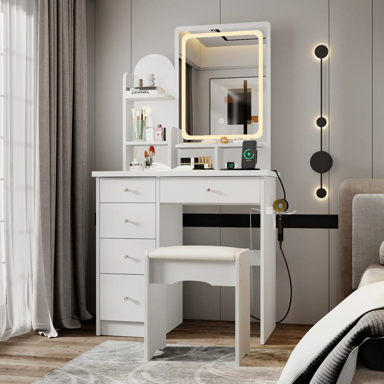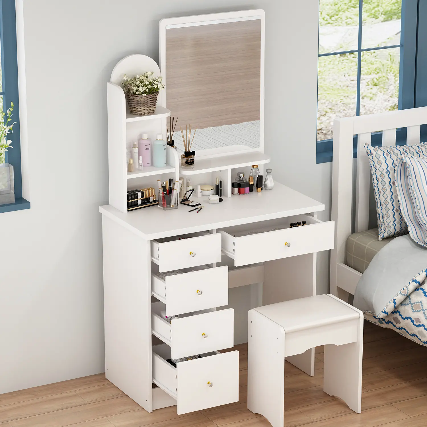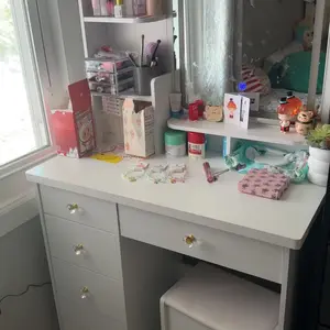 ·【Large Storage Space】3 open storage shelves, large makeup mirror, 5 drawers offer ample storage space for your makeup, perfumes, lotions, nail polish, hair accessories and more. Every day you can have all your beauty supplies and favorite collectibles in one place and in a fashionable, organized style.