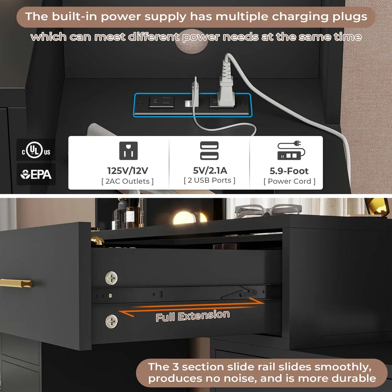 ·Material & Construction: Made of sturdy MDF board, waterproof, and scratch-resistant. High-quality 3-section metal slides in each drawer for smooth operation.