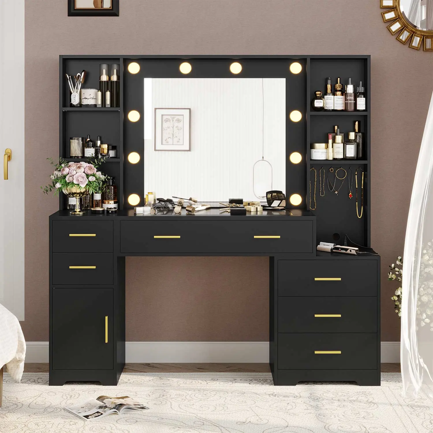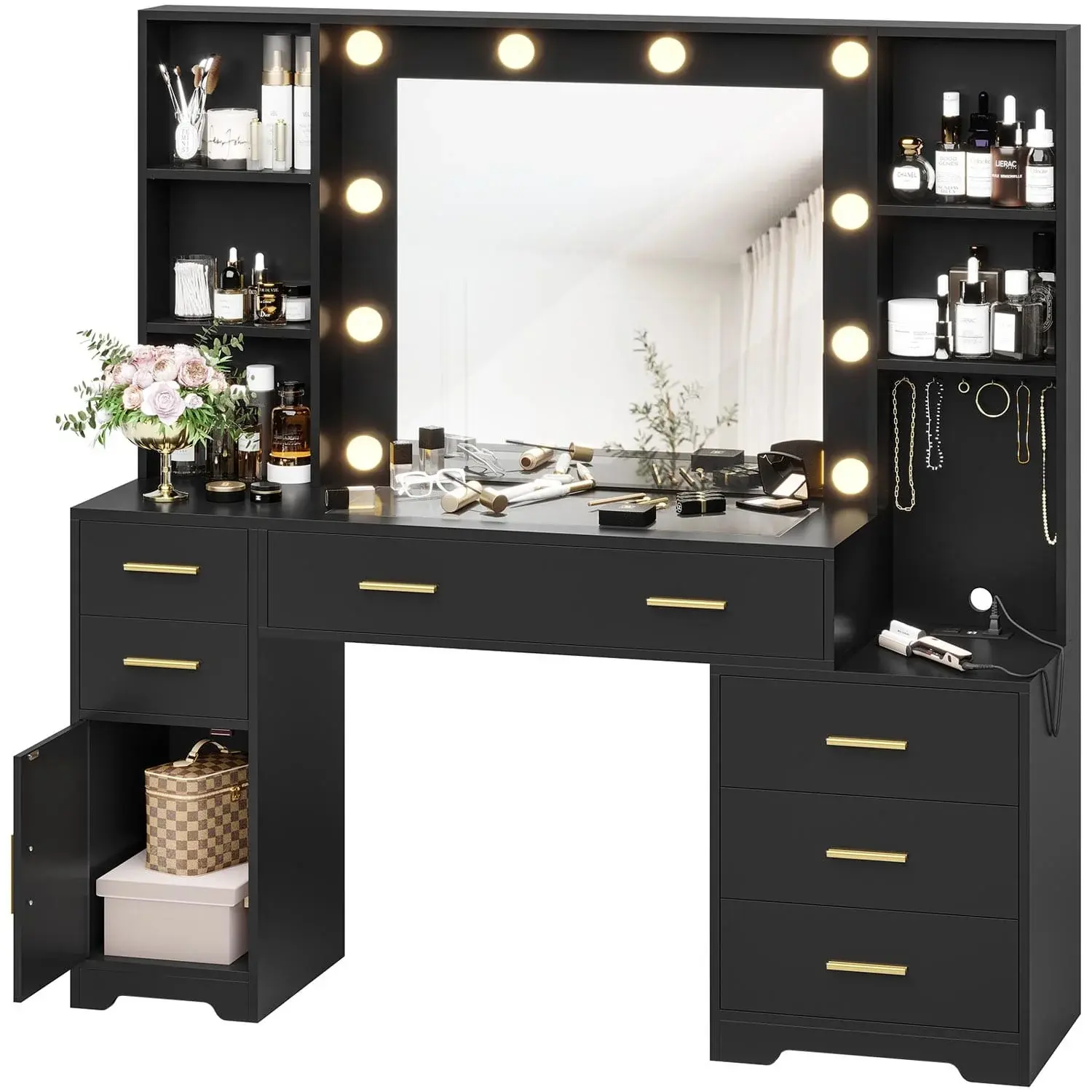 ·Great Storage Function: 48.8" large dresser with spacious tabletop and 4 shelves for makeup items. 6 hooks for organizing bracelets and necklaces. 6 drawers and 1 side cabinet for storage.