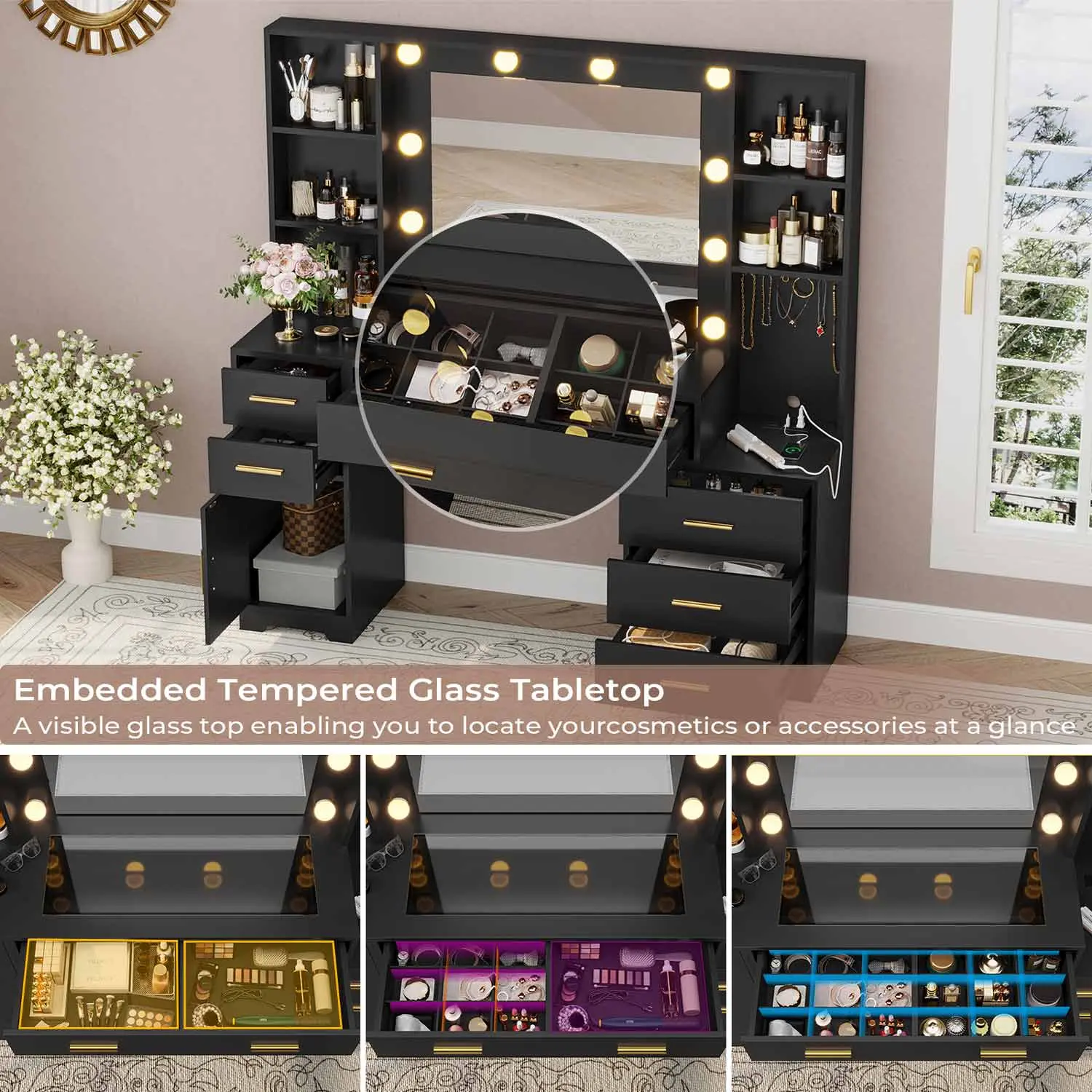 ·Charging Station: Equipped with 2 standard plug sockets and 2 USB ports for convenient use of hair dryer, curling iron, and charging electronic devices.
