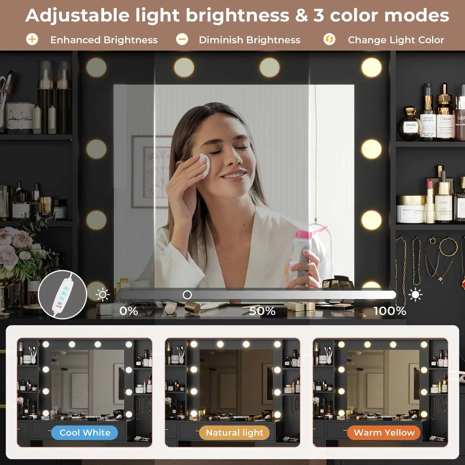 ·Large Vanity Desk with Lighted Mirror and Charging Station: Includes an HD large makeup mirror with smart LED lights. 10 LED bulbs with 3 color modes (cool white, natural light, warm yellow) for adjustable brightness.