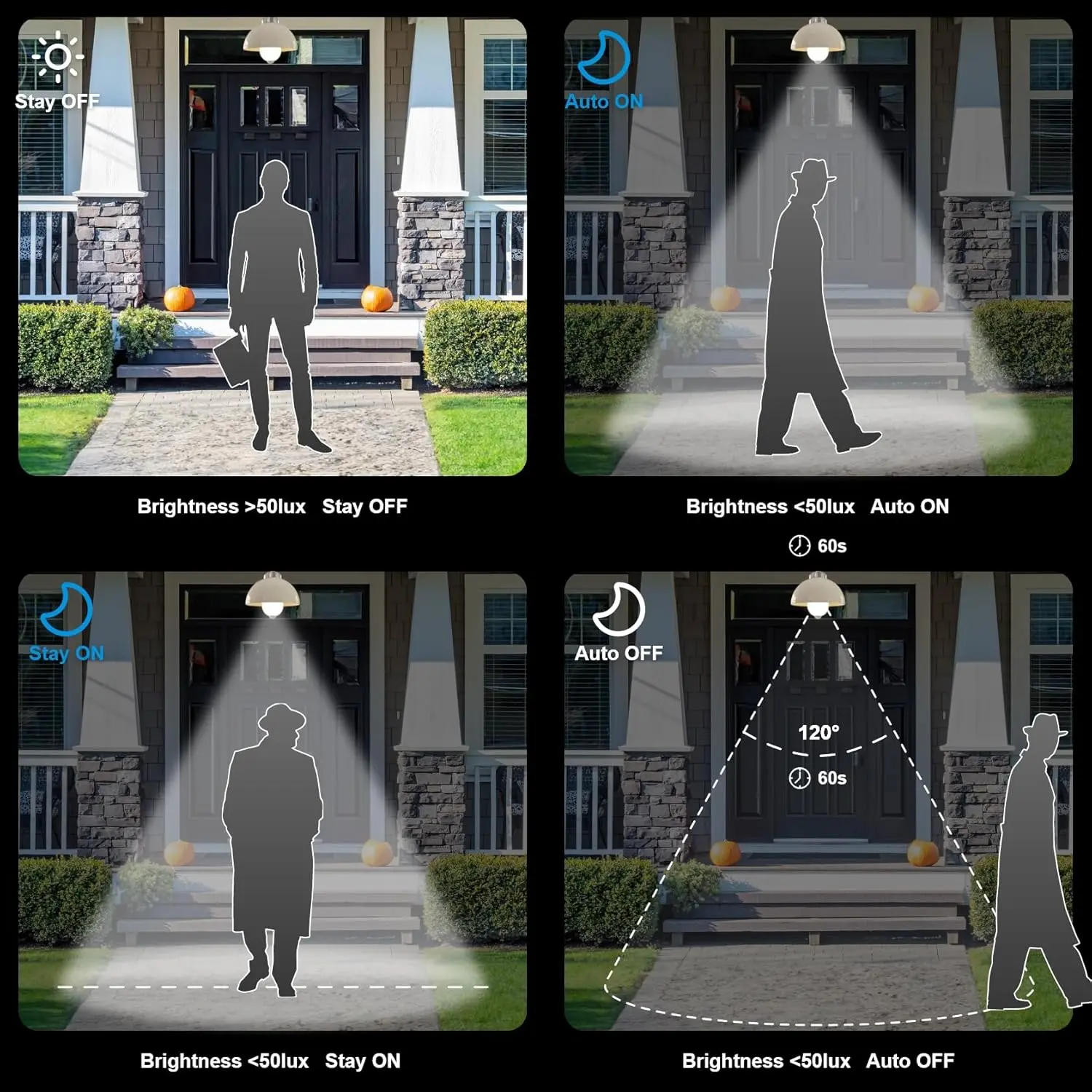 ·【Dusk to Dawn Sensor】Featuring an integrated dusk-to-dawn sensor, this device offers energy-saving convenience without the need for daily power switching. During daylight hours, it automatically stays off. In low-light conditions (brightness below 50 lux), it activates upon detecting motion, providing seamless and intelligent illumination.