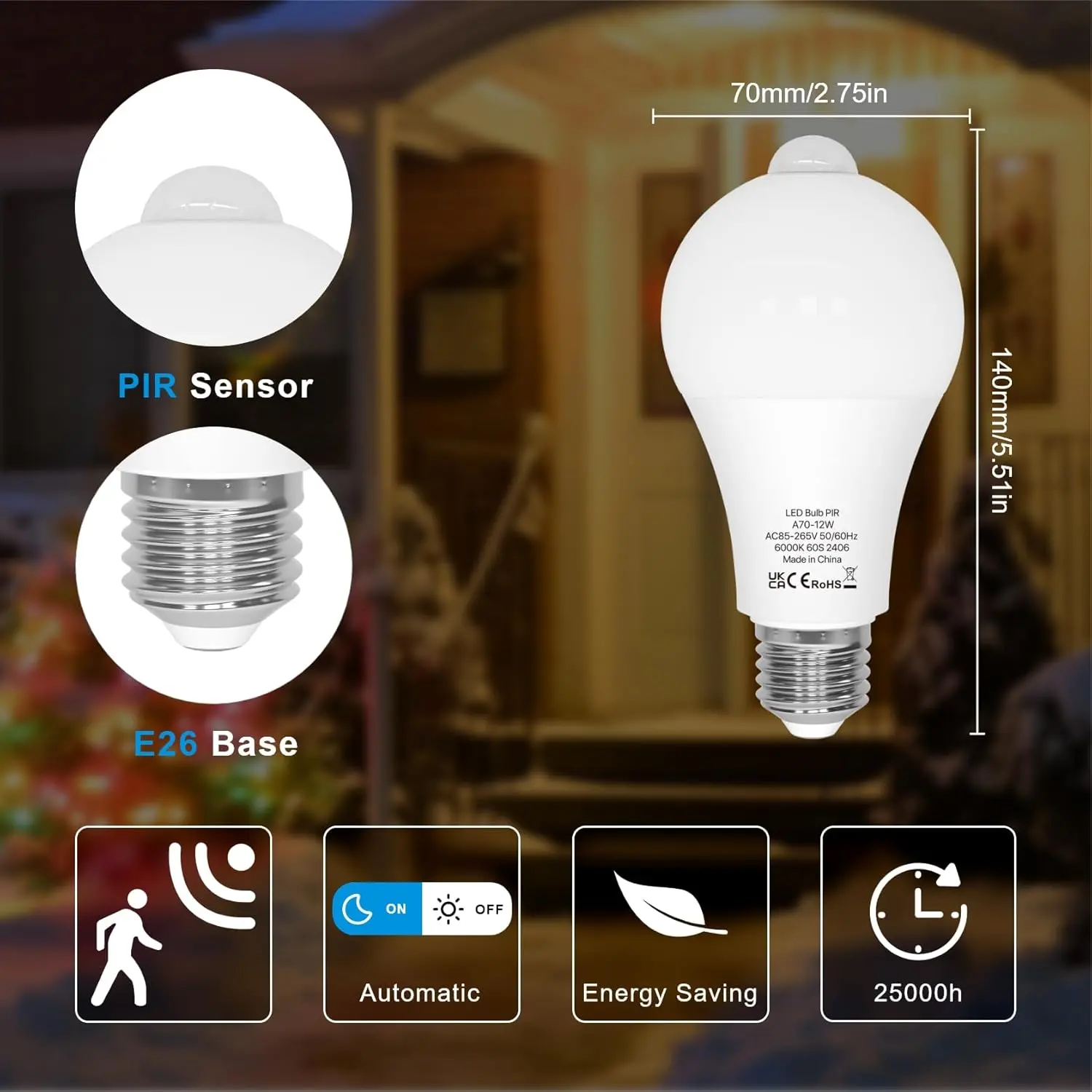 ·【Energy Saving】 The 12W motion-activated LED bulb has a bright 1200 lumens output, equivalent to a 100W incandescent bulb, saving up to 85% of energy. It has a long lifespan of up to 25000 hours, reducing the frequency of bulb replacement.