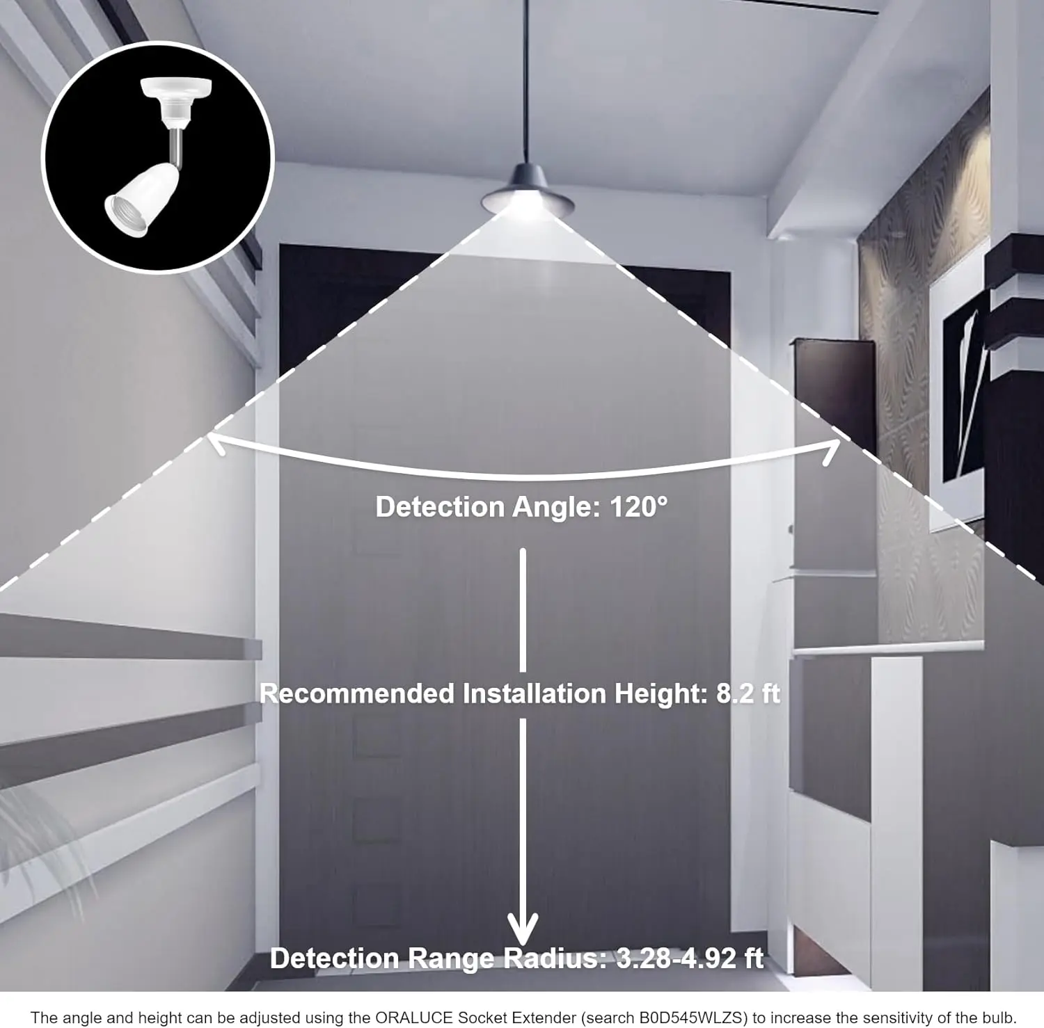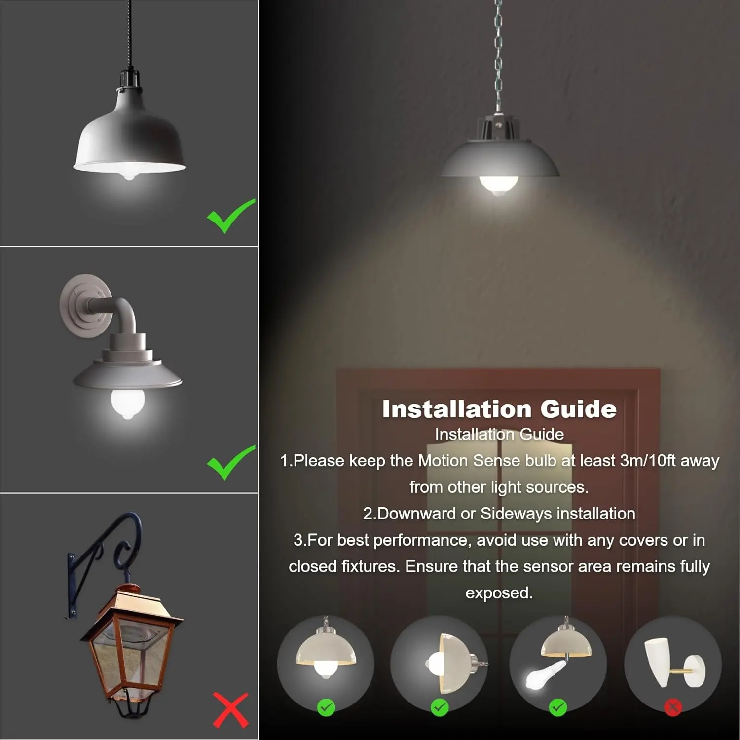 ·【PIR Motion Sensor】The top of the bulb is equipped with a sensitive PIR motion sensor that automatically lights up when motion is detected within 13 feet in the dark. It then turns off about 60 seconds after motion has stopped. (Note: 1. Please keep the power on. 2. Adjust the angle and height of the bulb installation to increase the sensitivity of the bulb.)