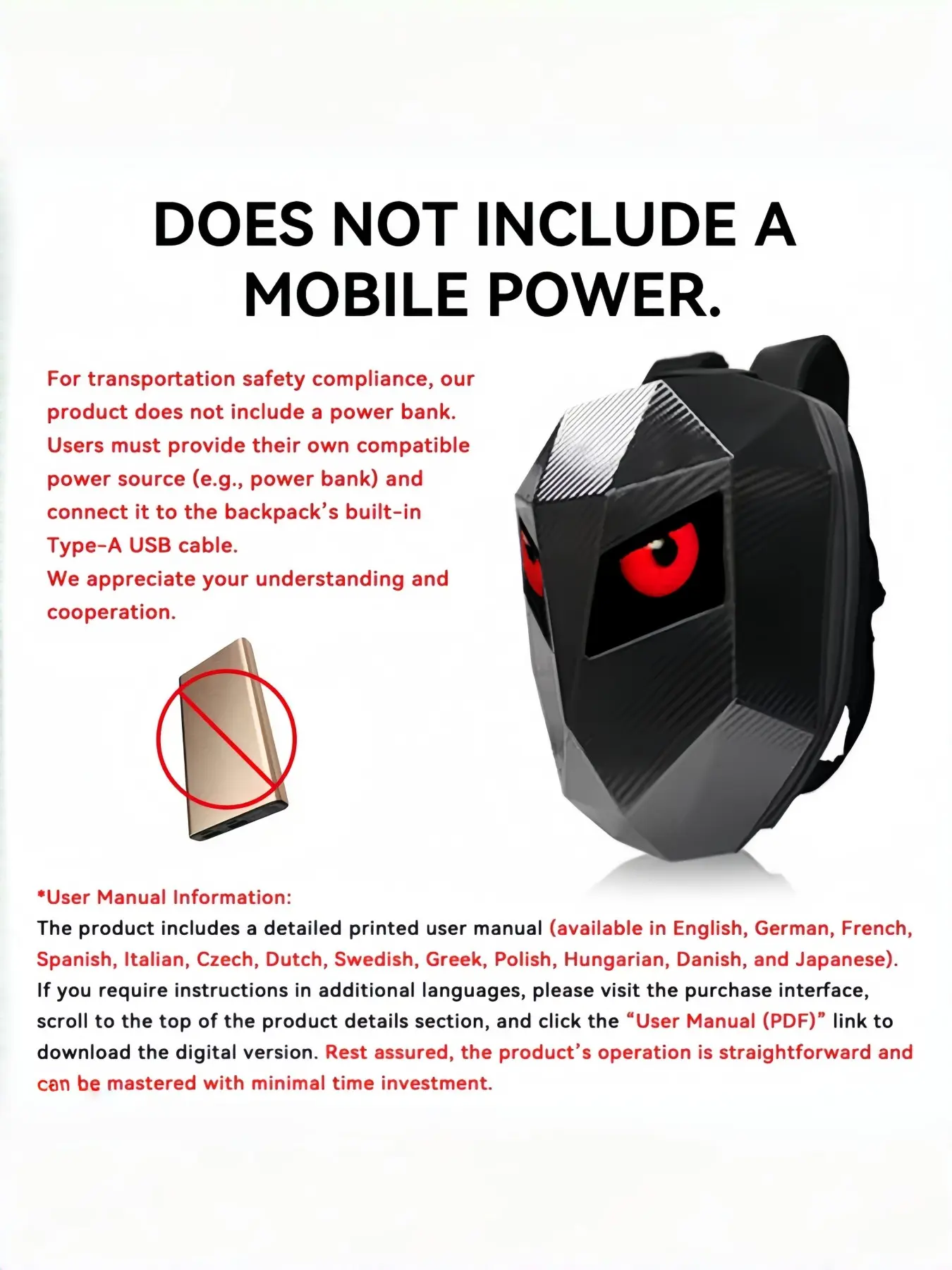 Note: This LED motorcycle backpack requires connecting to a power bank for use, but please note that the power bank is not included in the product. Therefore, it is nessary for you to prepare yours separately. (The power supply: 5V)