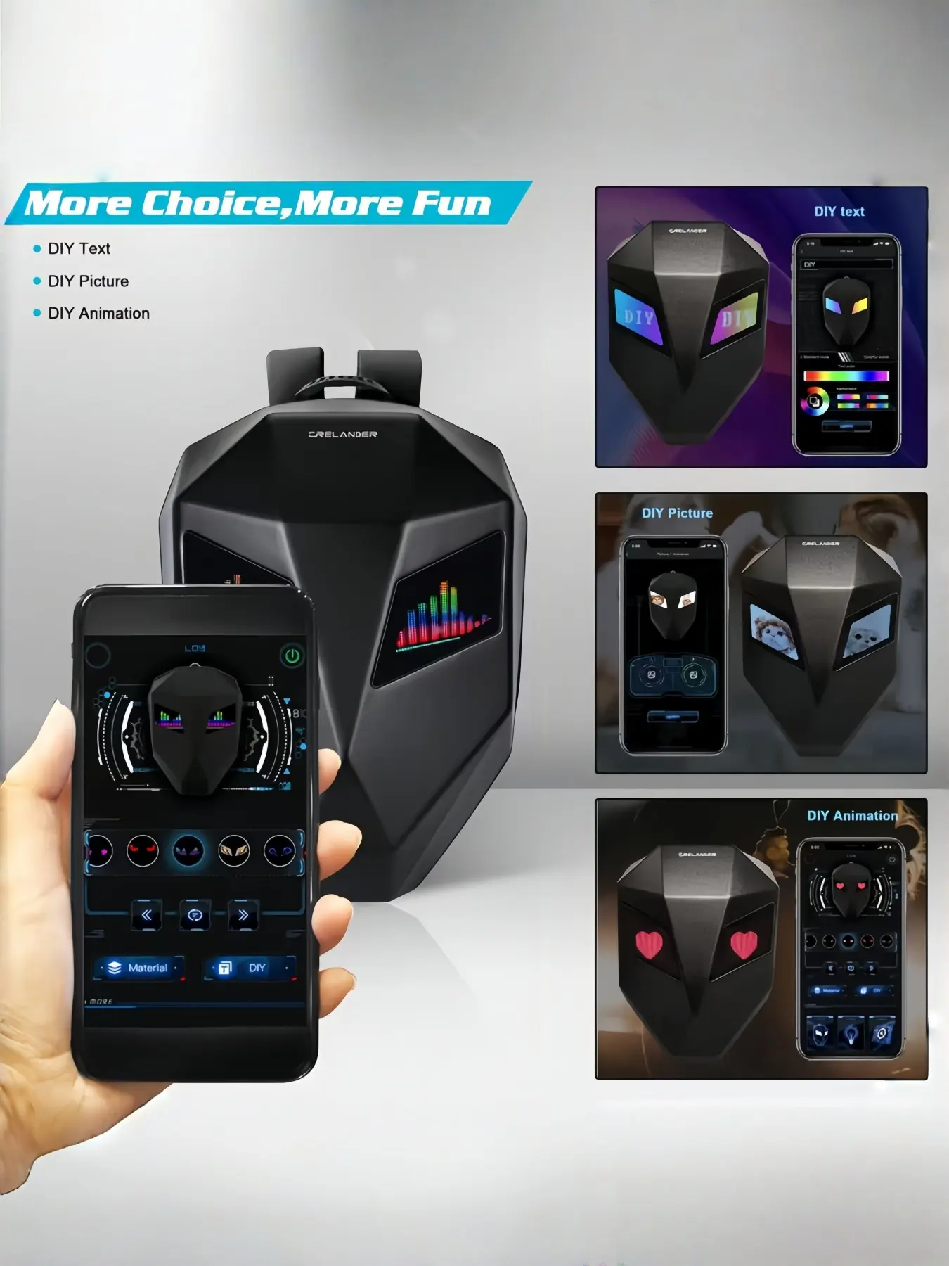 Customizable LED Display: Features a 48x48 full-color dot matrix display on the back, controllable via a mobile app. Users can freely program and display custom text, images, and GIF animations to express personal style.