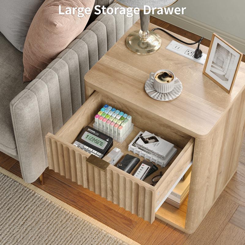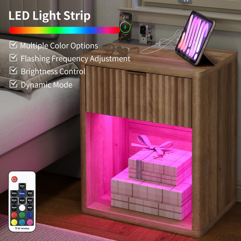 Multi-functional Nightstand: This LED nightstand measures 22.64'' x 15.35'' x 23.74'', the overall lines are simple and elegant, the drawers adopt wave design, which adds a little bit of dynamic beauty to the bed side table; It will be the focus of people's attention when placed alone or in pairs, perfect for bedroom, living room, offices and studio
