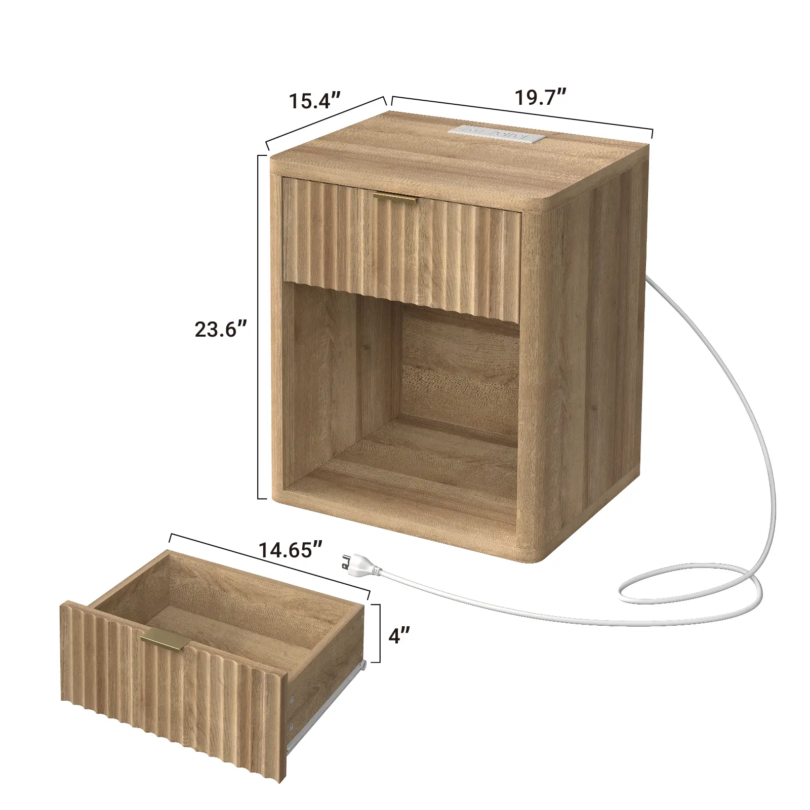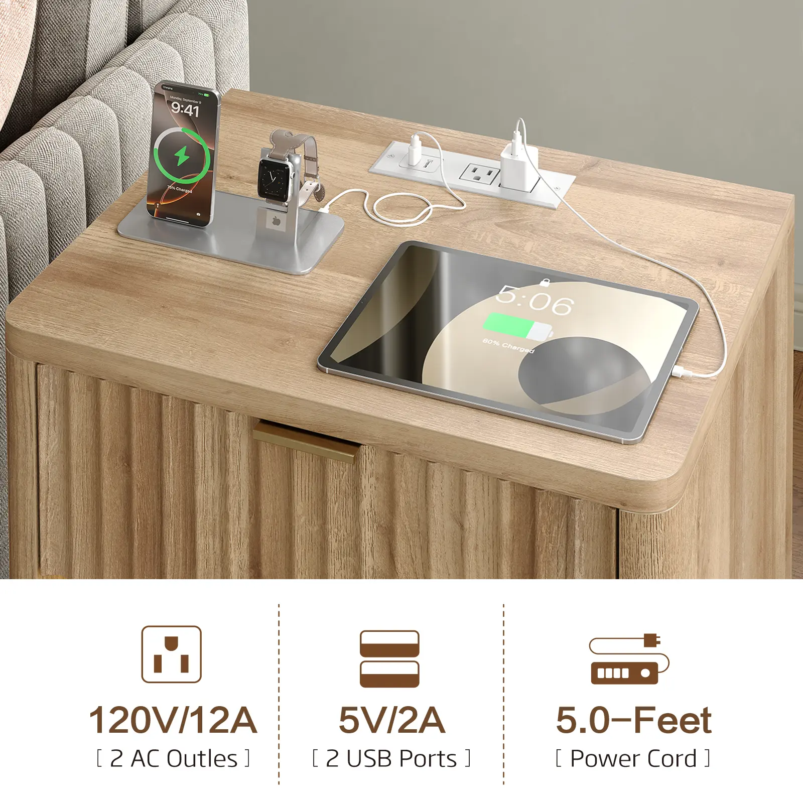 Night stand with Charging Station: The night stand is equipped with built-in electrical outlets, including 2 standard plug sockets and 2 USB ports, ensuring that your devices can be charged at any time without having to worry about finding a socket, you can connect your cell phones, computers, ipads, lamps and other electrical appliances at any time