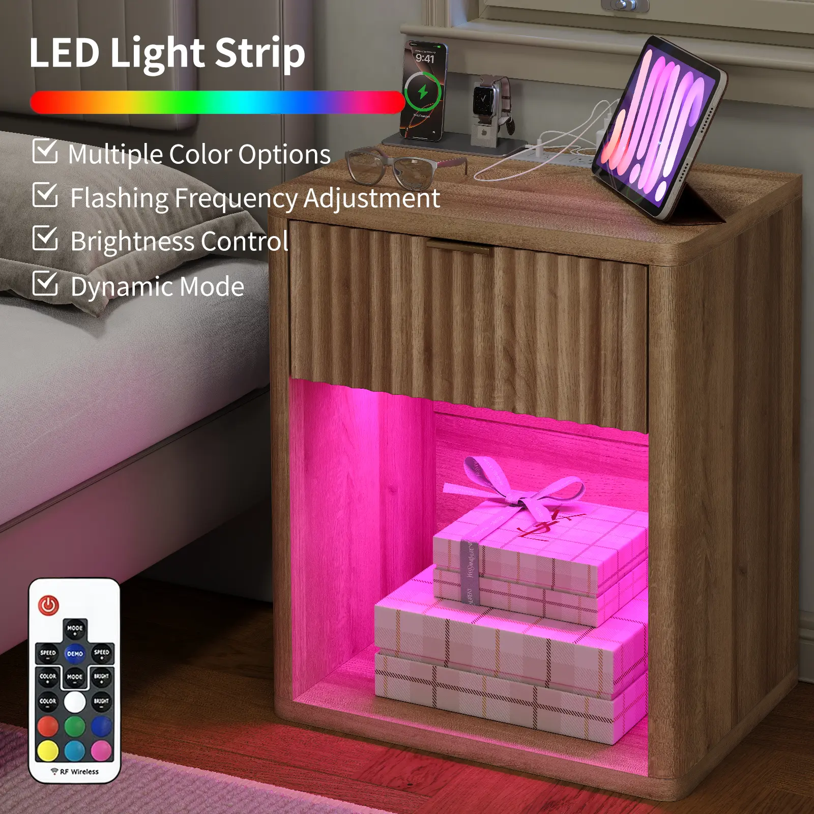 LED Night Stand: The night stand has a hidden LED strip under the drawer, including 7 colors of light, adjustable brightness, dynamic and static modes, soft light will not hurt your eyes; You can use the remote control to adjust the light to match your mood or music to create the desired ambiance in your bedroom