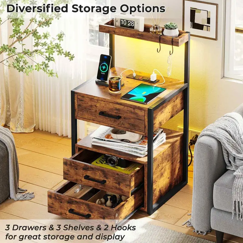 Nightstand End Table Bedside Table with Charging Station and LED Lights, 3 Drawers, 2 AC Outlets, 2 USB Ports