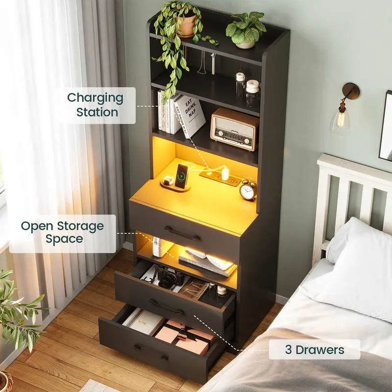Sikaic LED Tall Nightstand with Charging Station 3 Drawers And Bookshelf Adjustable Table