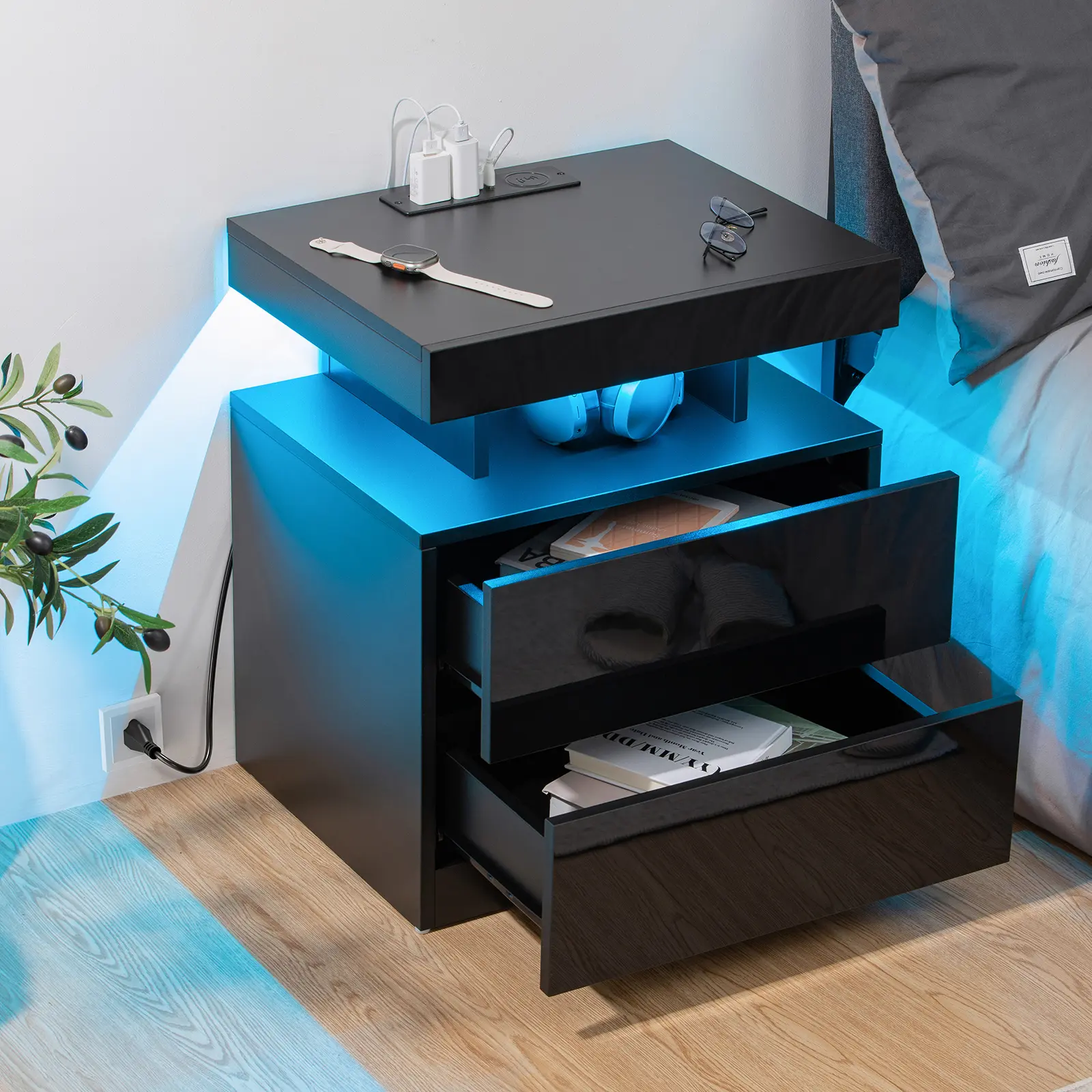 ·2 drawers + open shelf for books, lamps & gadgets