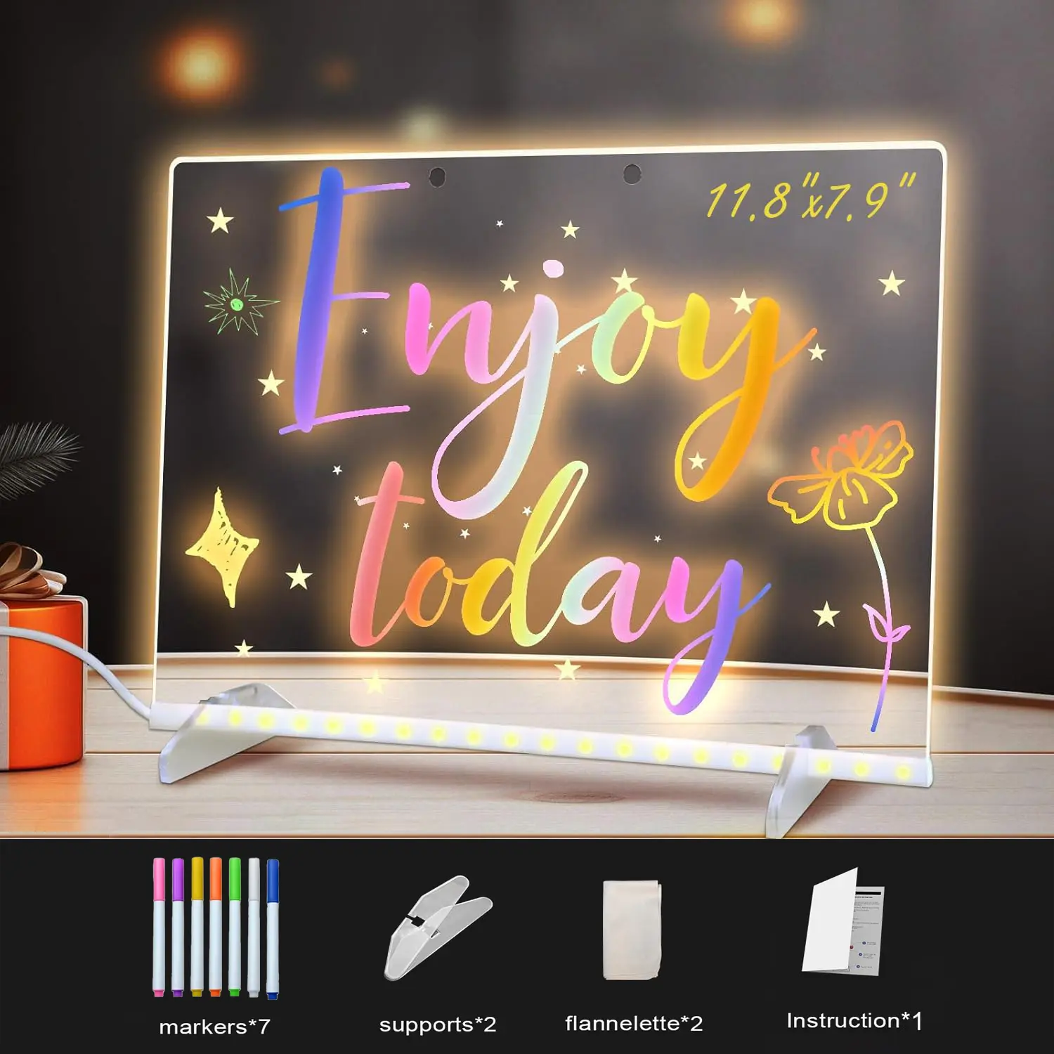 Complete Accessories- 2 Invisible Stands: For stable setup.- Reliable Adapter: Ensures stable power supply.- Soft Cleaning Cloth and Spray Bottle: For easy maintenance.- Hanging Kit: Includes hooks and durable chain.- 7 Vibrant Pens: Red, blue, green, black, purple, orange, and pink.