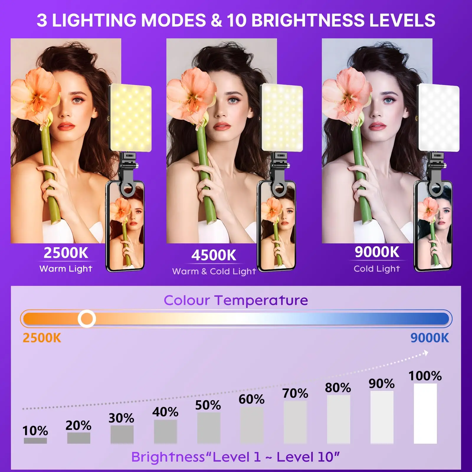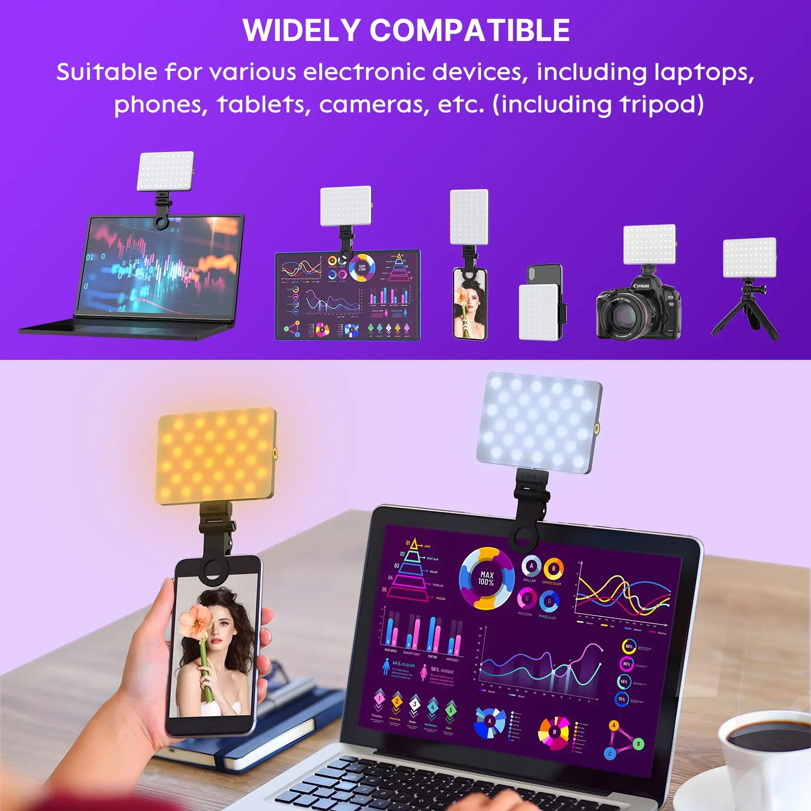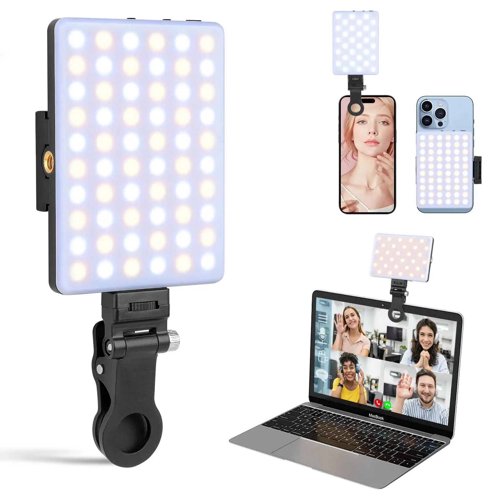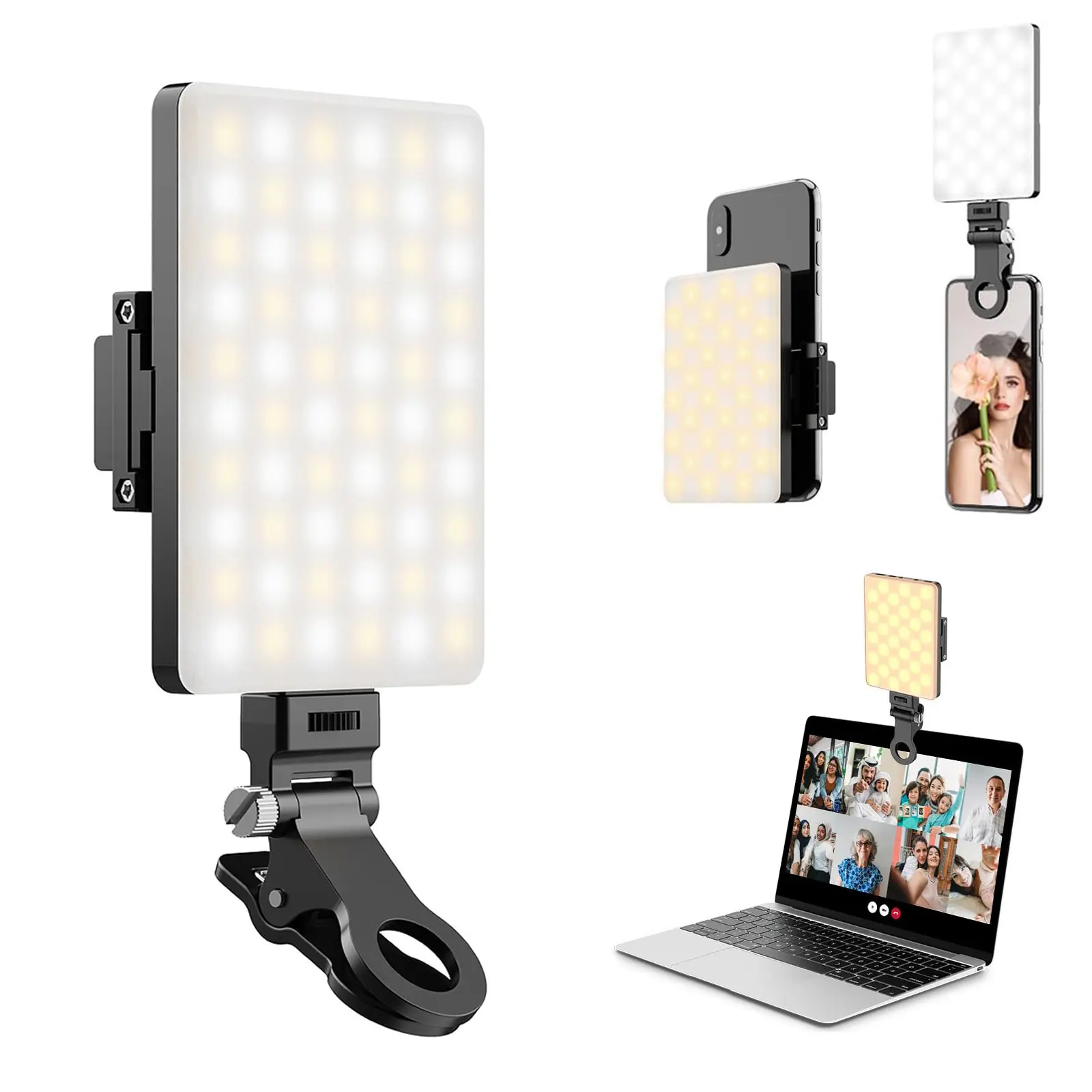 Ever struggled with bad lighting during your video calls or makeup sessions? This LED Selfie Light is here to brighten your day (and your face)! Featuring 60 high-brightness LEDs, it offers 3 versatile light modes—warm, natural, and white—with 10 adjustable brightness levels to make you look flawless anytime, anywhere. Whether you're live streaming, vlogging, or just snapping selfies, the dual clip design ensures a snug fit on your phone, tablet, or laptop. The light rotates smoothly for the perfect angle, while the powerful 3000mAh rechargeable battery gives you 2 to 5 hours of glow on a full charge. Fast charging via Type-C or Micro USB means less waiting, more shining. Ready to upgrade your lighting game? Clip it on, adjust your glow, and let your best self shine through!