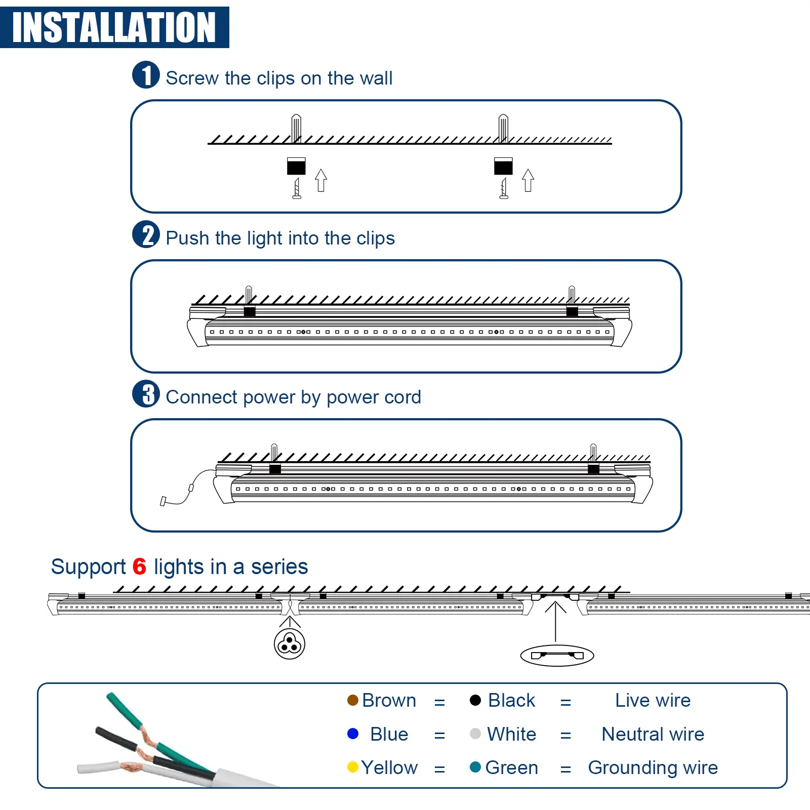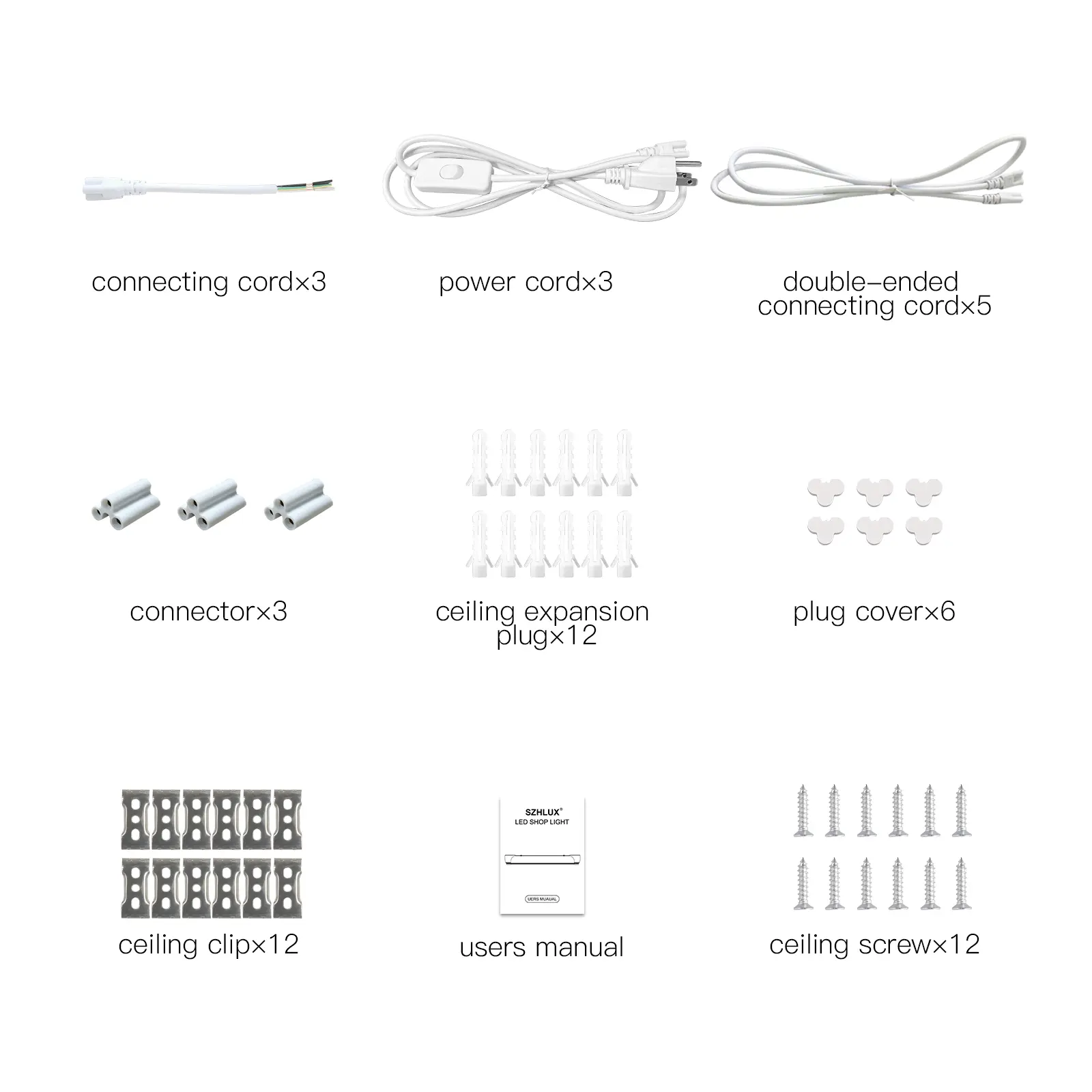 ·asy Installation:Plug & Play.Come with 59" power cord with on/off switch,and other small accessories,These shop lights can be effortlessly installed in minutes,requiring no additional tools or complicated wiring.