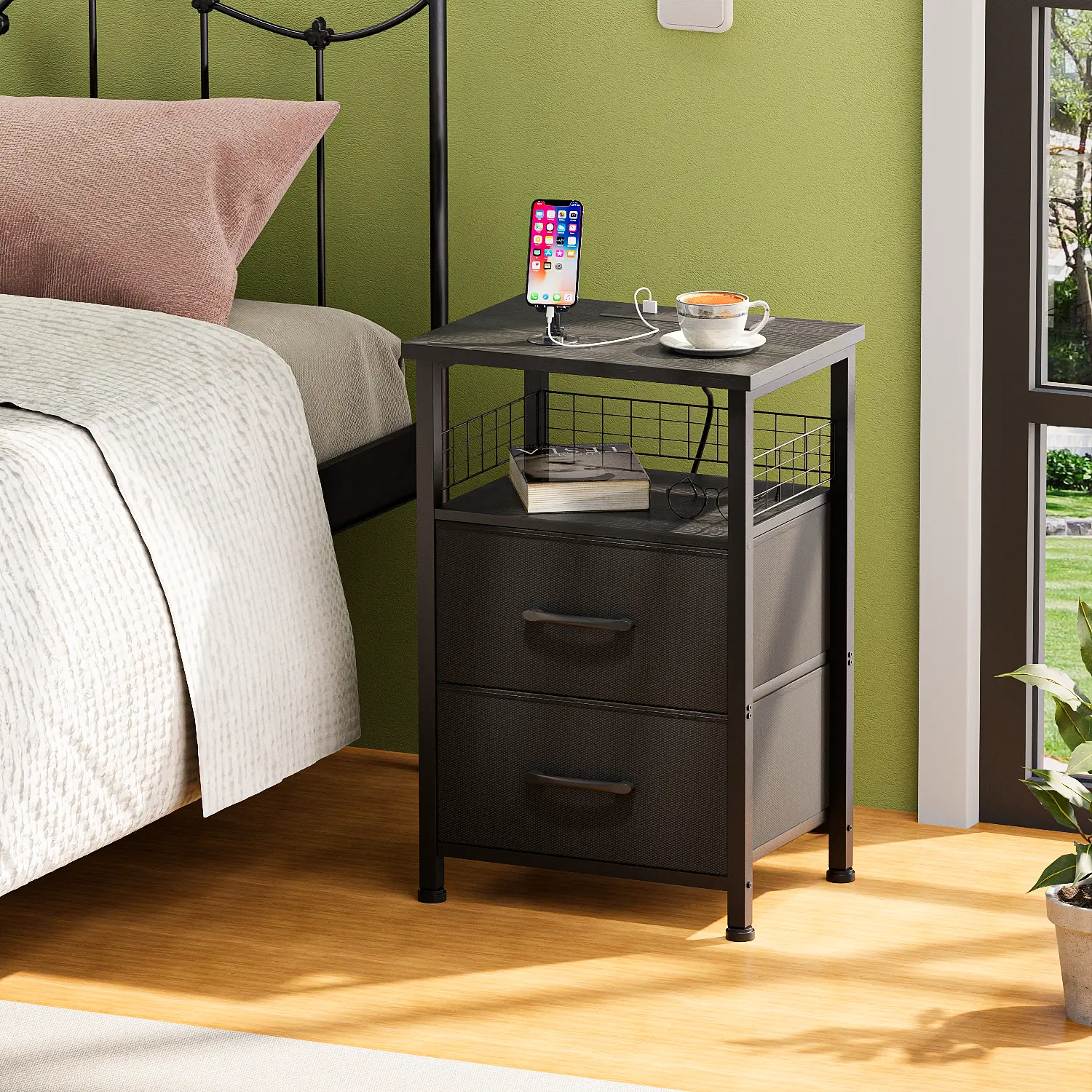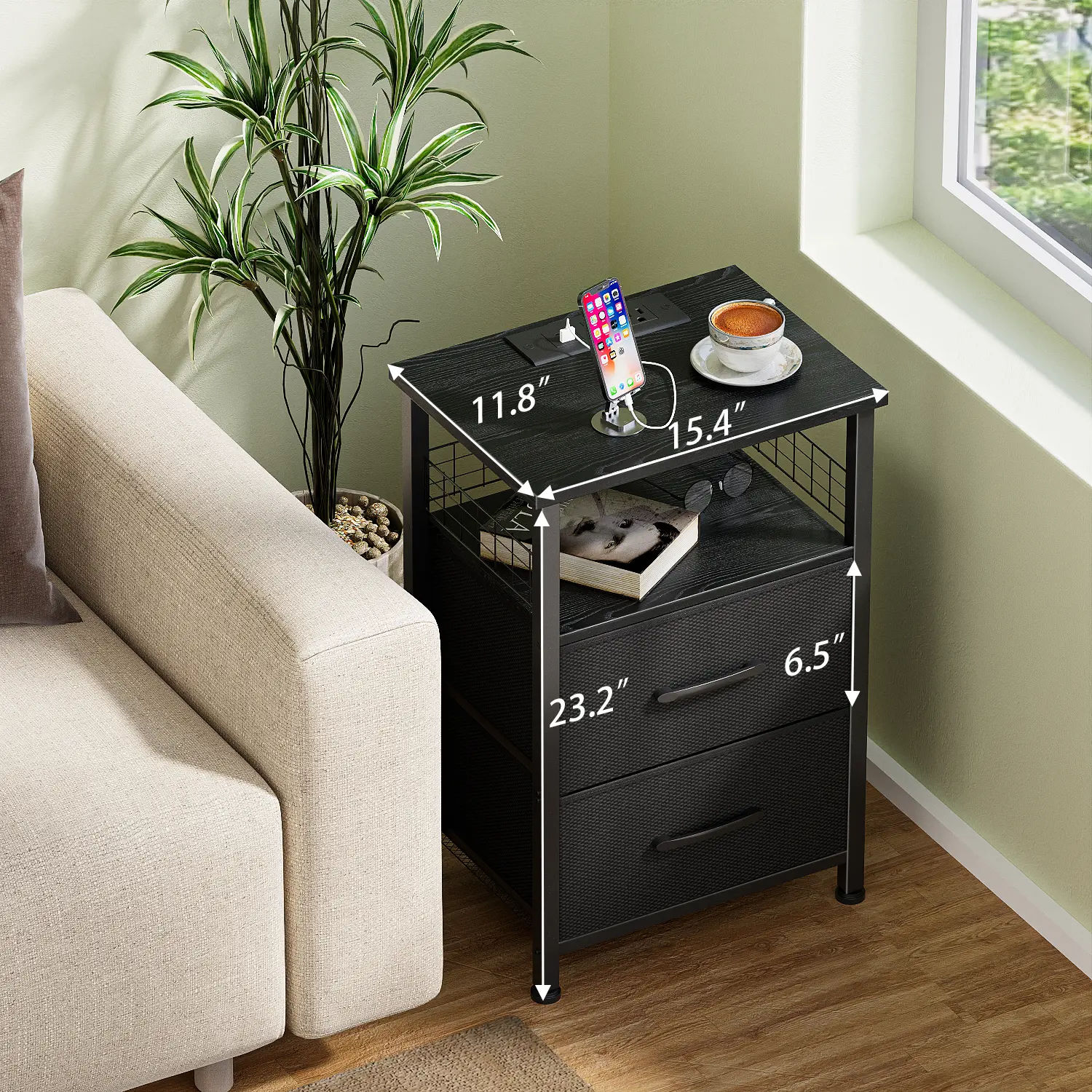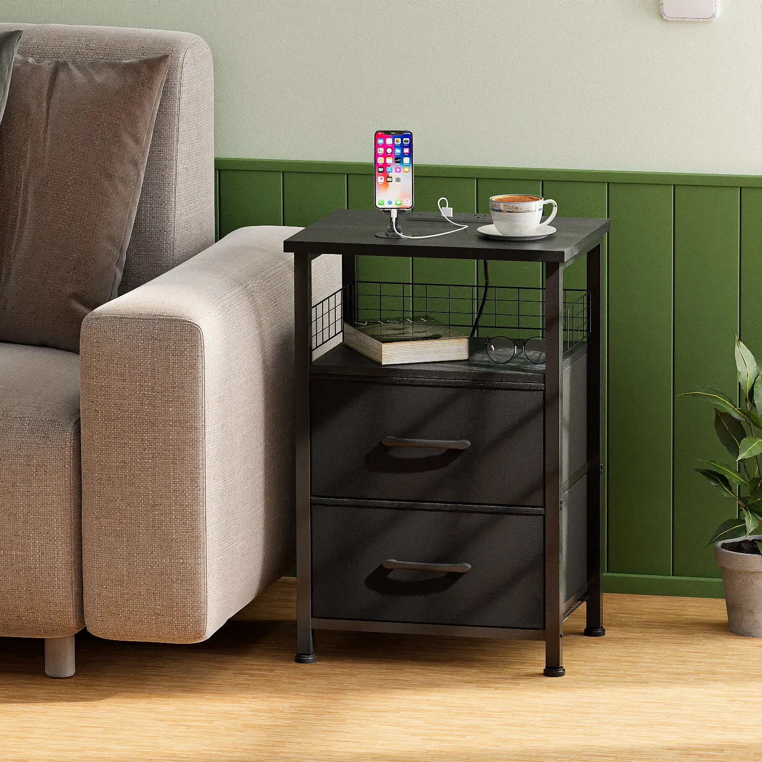 Upgrade your living space with this LED Side Table featuring a built-in charging station. Perfect for modern homes, this nightstand includes USB ports and outlets for convenient charging. The sleek black design complements any decor. Ideal for living rooms and bedrooms, it offers practical storage with 2 PU-coated fabric storage drawers.