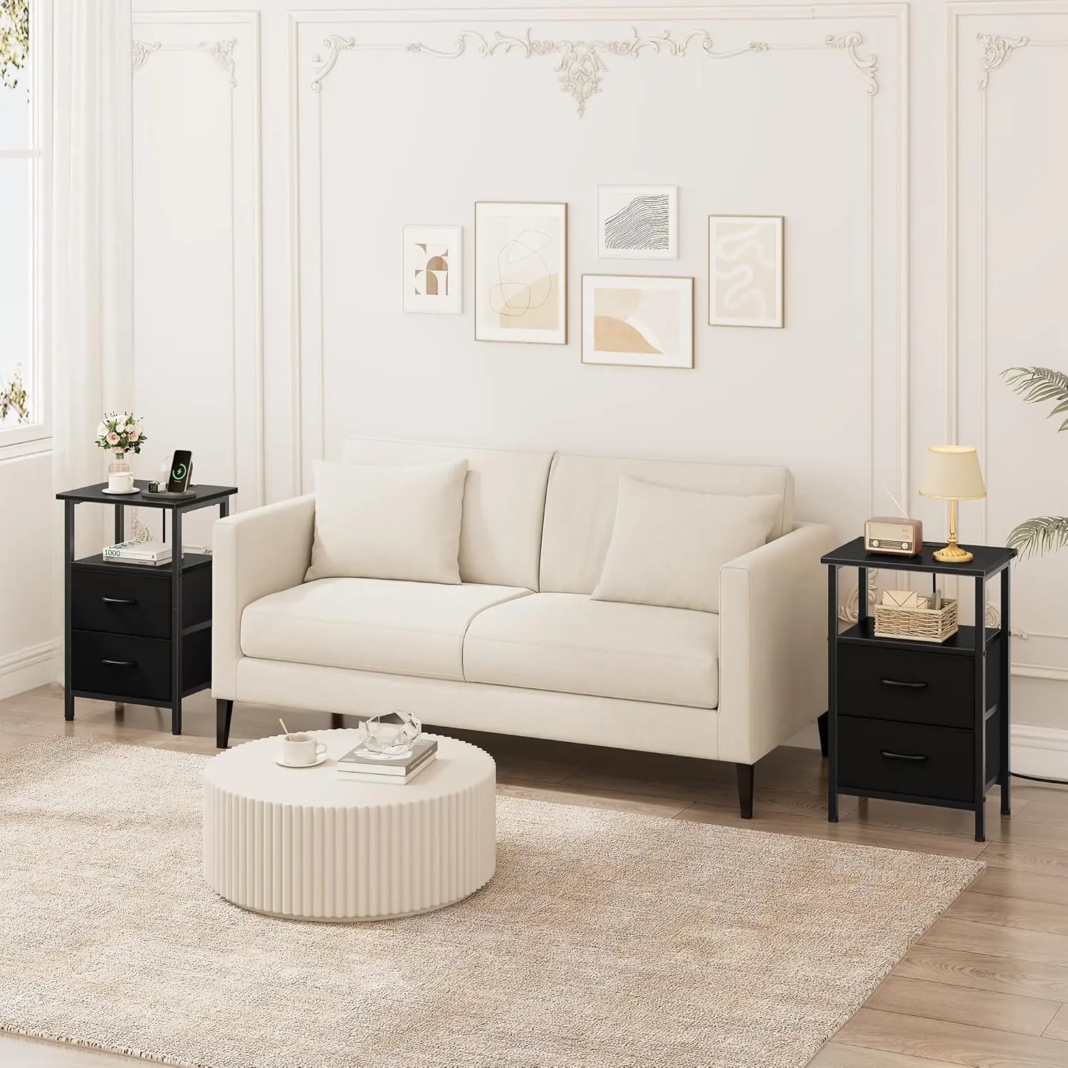 This side table is a versatile addition to any home. Its design combines functionality with style. The PU-coated fabric drawers add a touch of elegance while providing practical storage. Whether in the living room or bedroom, this table is a must-have for modern homes.