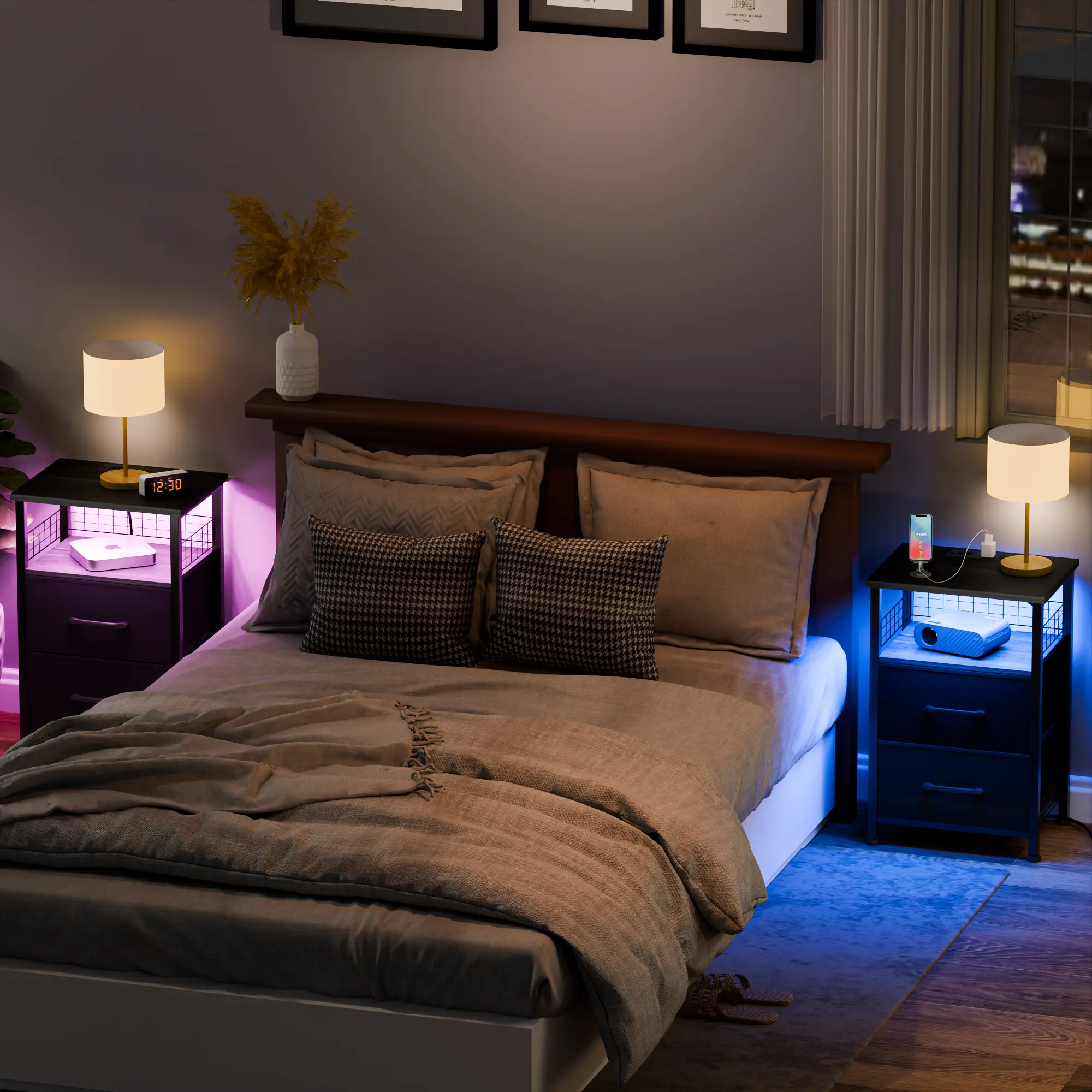 ·LED Nightstand: Provides ambient lighting and charging convenience.