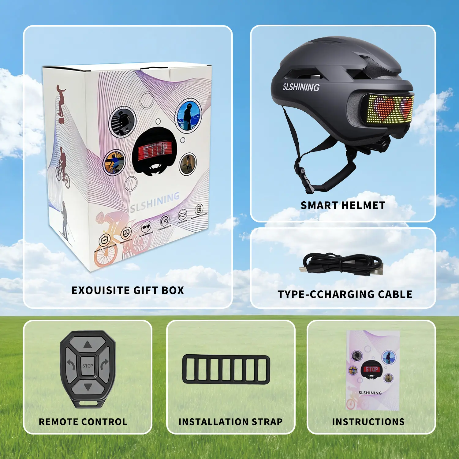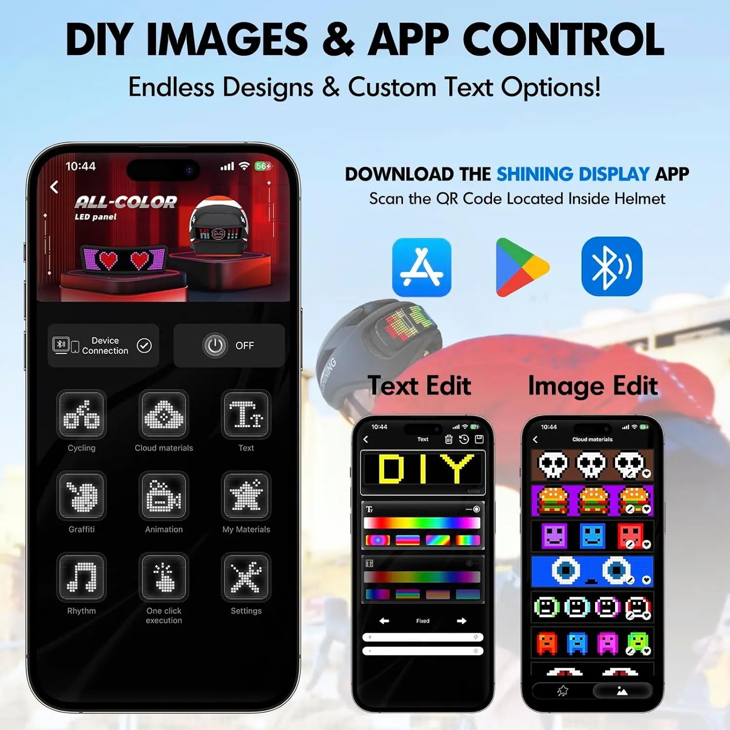 Download the included app to control the helmet's LED display directly from your phone. In riding mode, the helmet's display shows real-time riding information: direction, speed, and braking status. "Start" is displayed when moving, "Stop" is displayed when braking, and a signal is given to turn left or right depending on your movements. You can also upload custom designs to create unique animations and messages for a personalized experience.