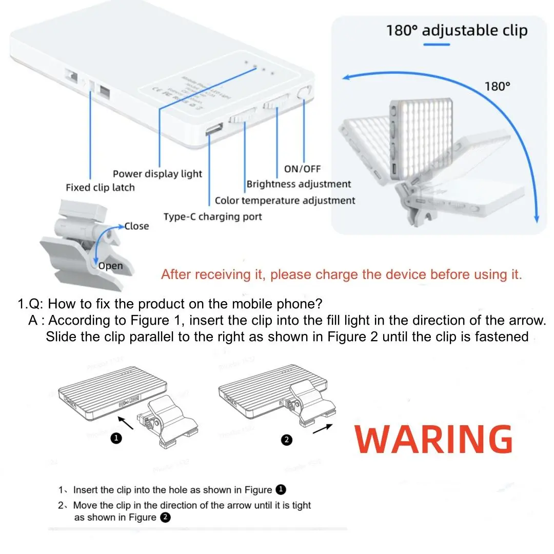 The light itself is bright does what it's supposed to but the clip is so wide it covers my camera up if I use my phone upright and the battery does not last long at all