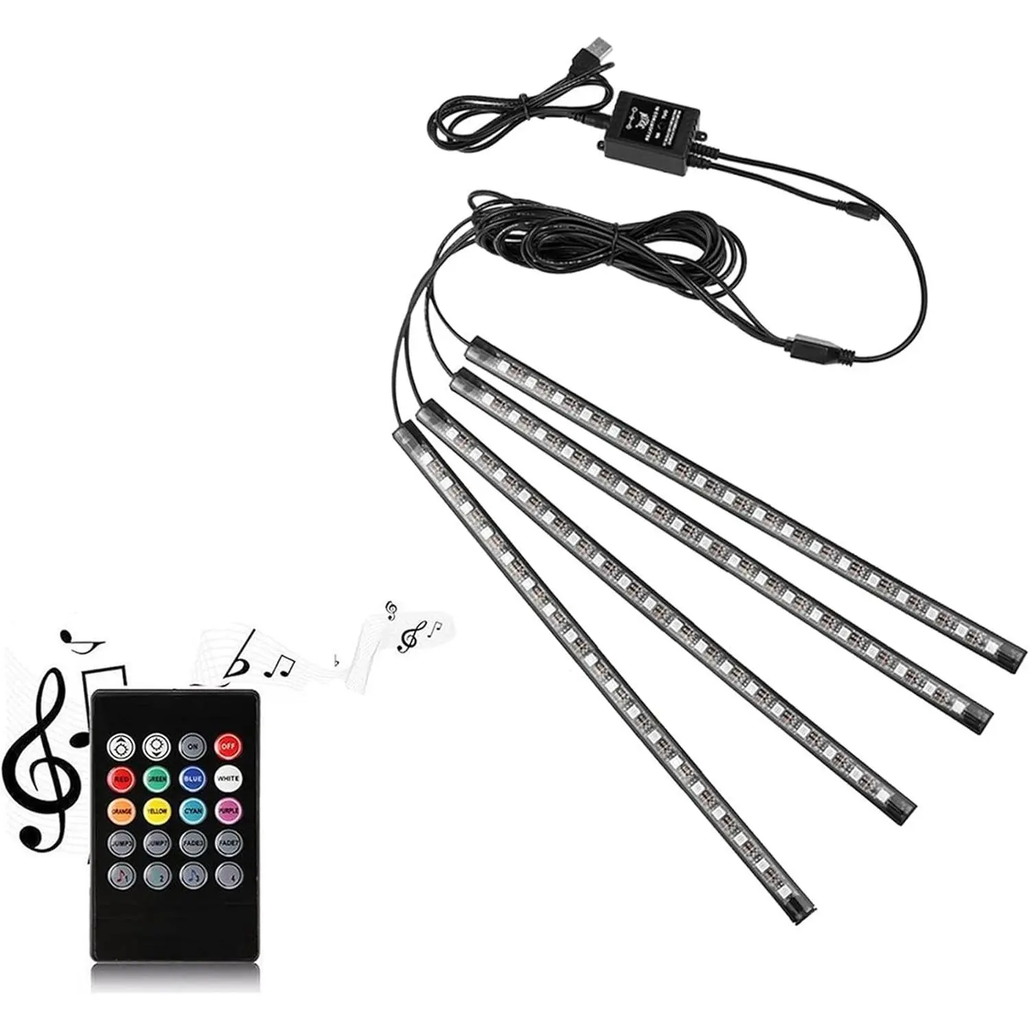 Package Include: 4 x SMD5050 LED Lights; 1 x Remote Control; 1x IR Control Box; 1x USB Port