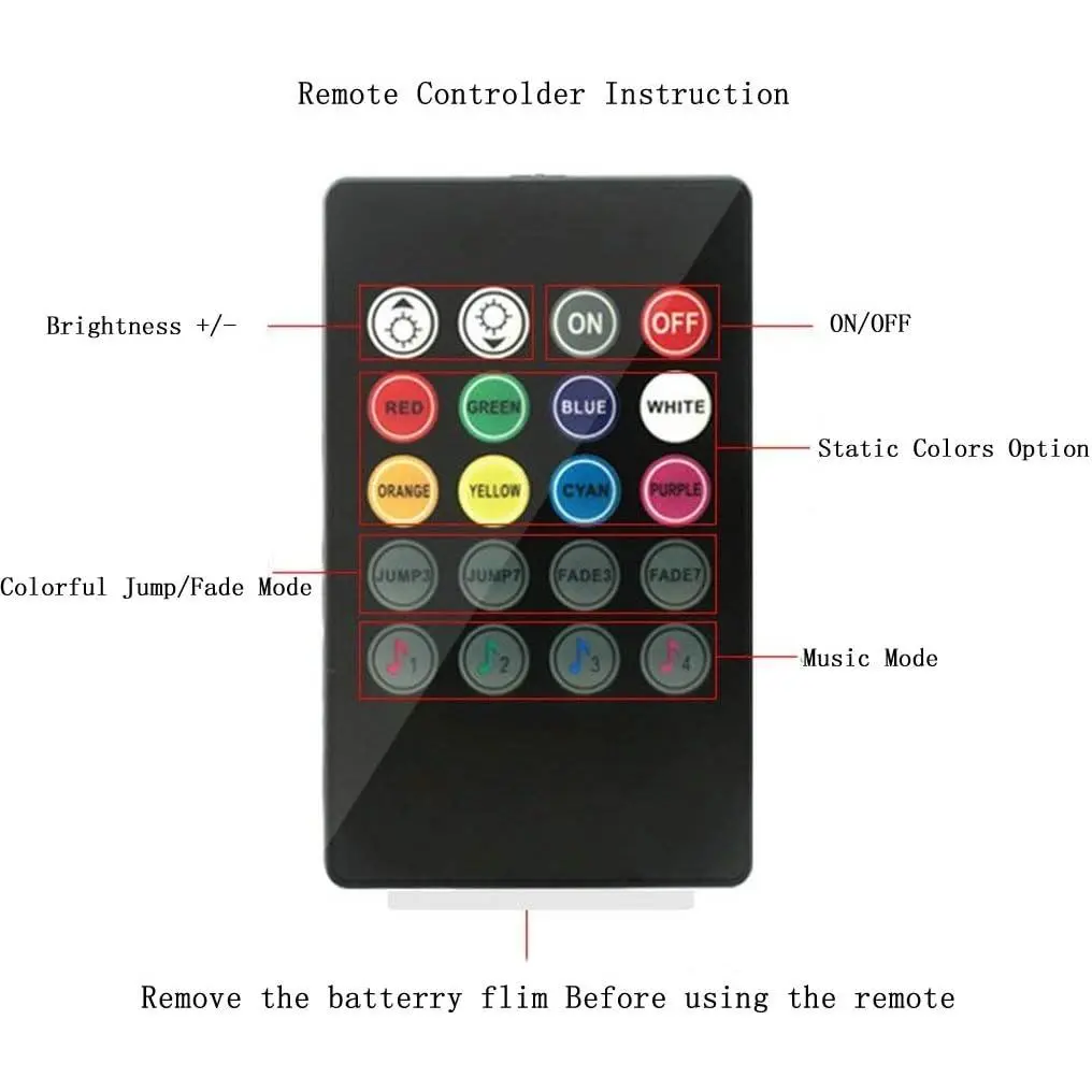 8 Color RGB LED Interior Atmosphere Lights, Remote Control enable you to change the color and adjust the brightness as you wish, also Sound-activated Function allow you to the fun with the color changing following your stereo rhythm as well as your voice