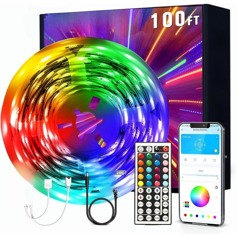 RGB LED chips offer vibrant and durable lighting. The remote controls dim the LED light strip and offers different colors and modes. The package includes: 1 roll 100ft LED strip lights, 1 IR remote control, 1 power adapter, and 1 instruction manual. Enhance your life with smart LED strip lights.