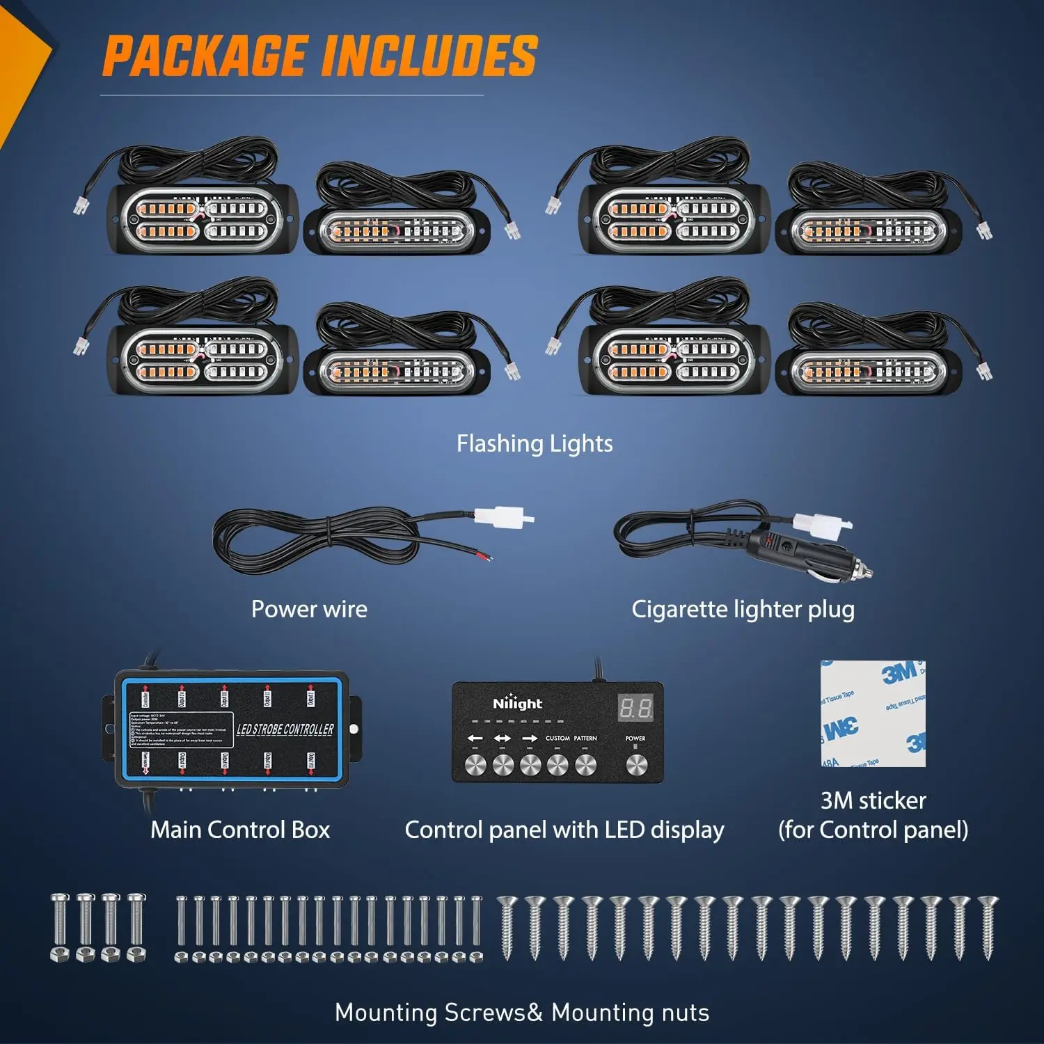 Nilight 8Pcs Surface Mount Strobe Lights consist of 4pcs single row 12 LED chips and 4pcs double row 24 LED. The main control box provides a free wiring installation and is perfectly synchronized with your lights.