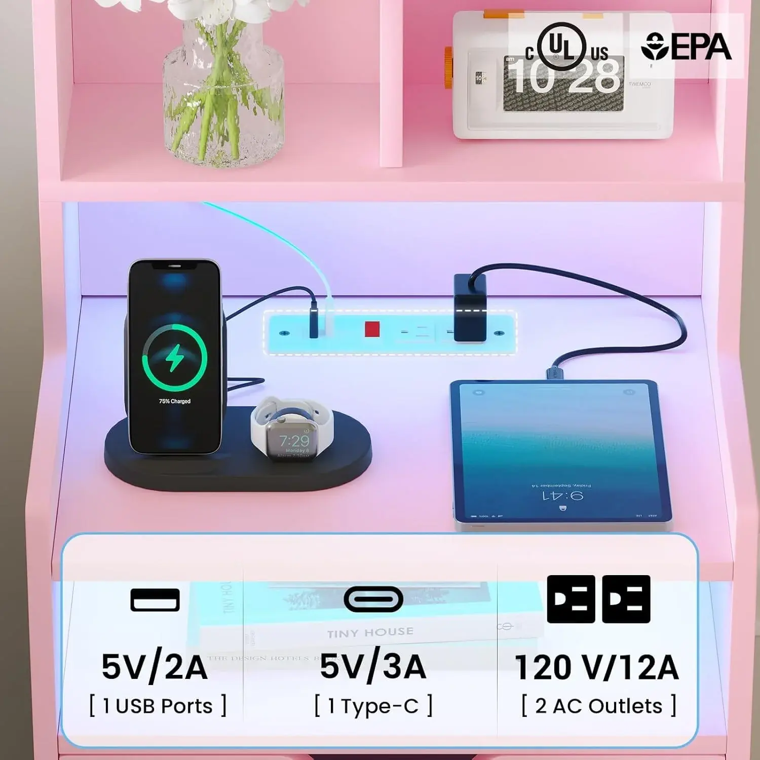 ·Charging Station: 2 power outlets and 2 USB ports.
