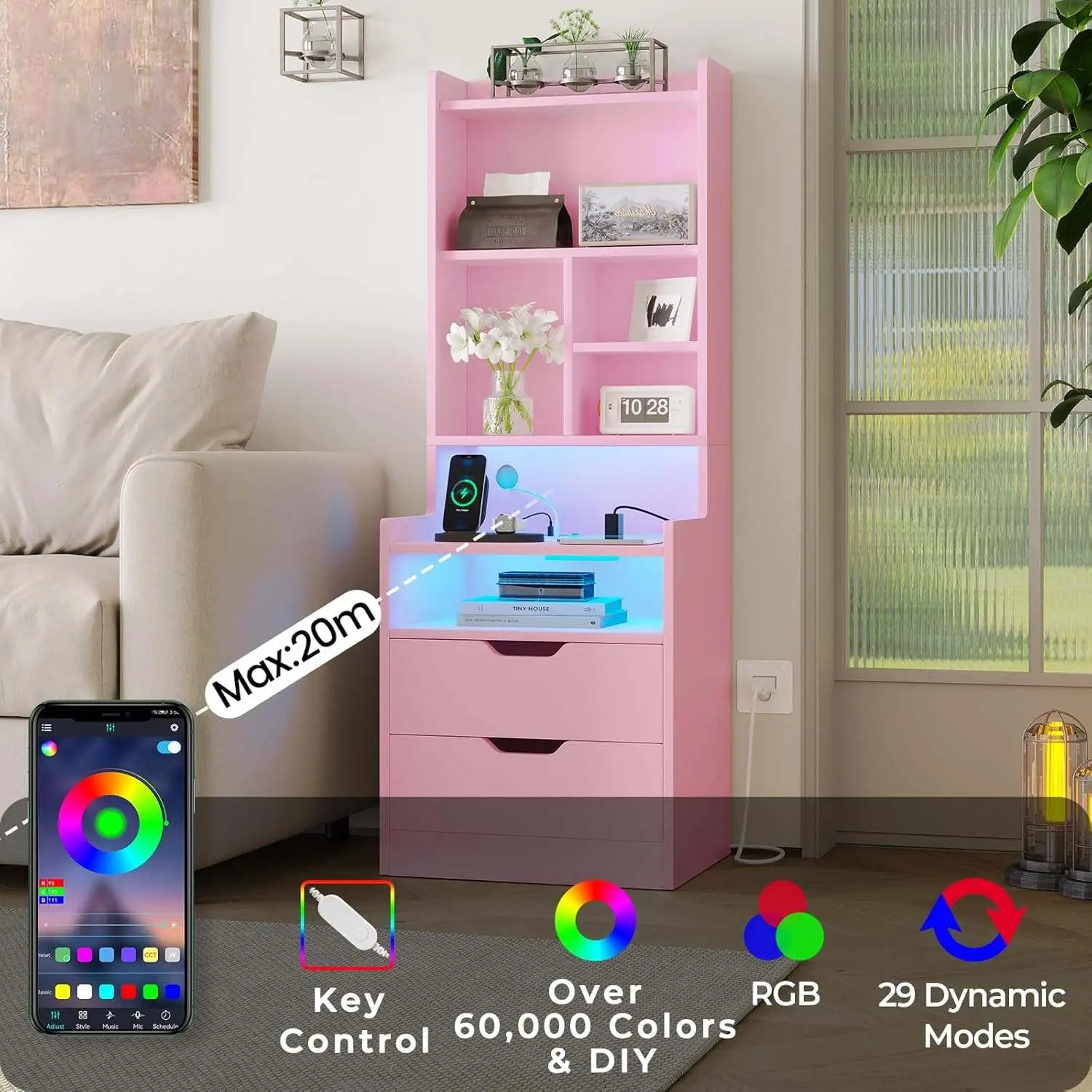 The Sikaic LED Tall Nightstand combines a nightstand with a bookshelf, offering ample storage and organization. It features RGB LED lights with over 60,000 colors, controlled via a phone app or button switch. The nightstand includes 2 USB ports and 2 power outlets for convenient charging. Perfect for modern bedrooms, it measures 13.8"D x 17.7"W x 50"H and weighs 33 pounds.