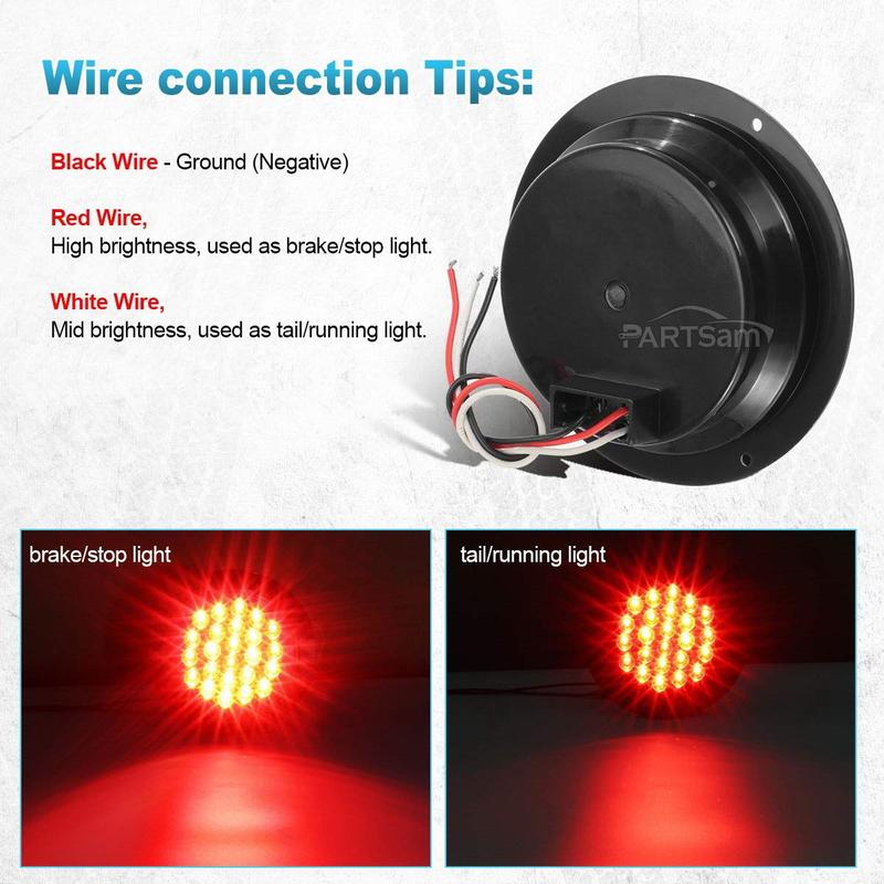 Package includes 10pcs 4 Inch Round Led Tail Lights; 4" Round Waterproof trailer light serves 3 functions: brake, tail, and turn. Recessed mount with built-in flange. Sealed Hardwired connection with 3 Stainless Steel Scres. 12 Super diodes. Red lens;