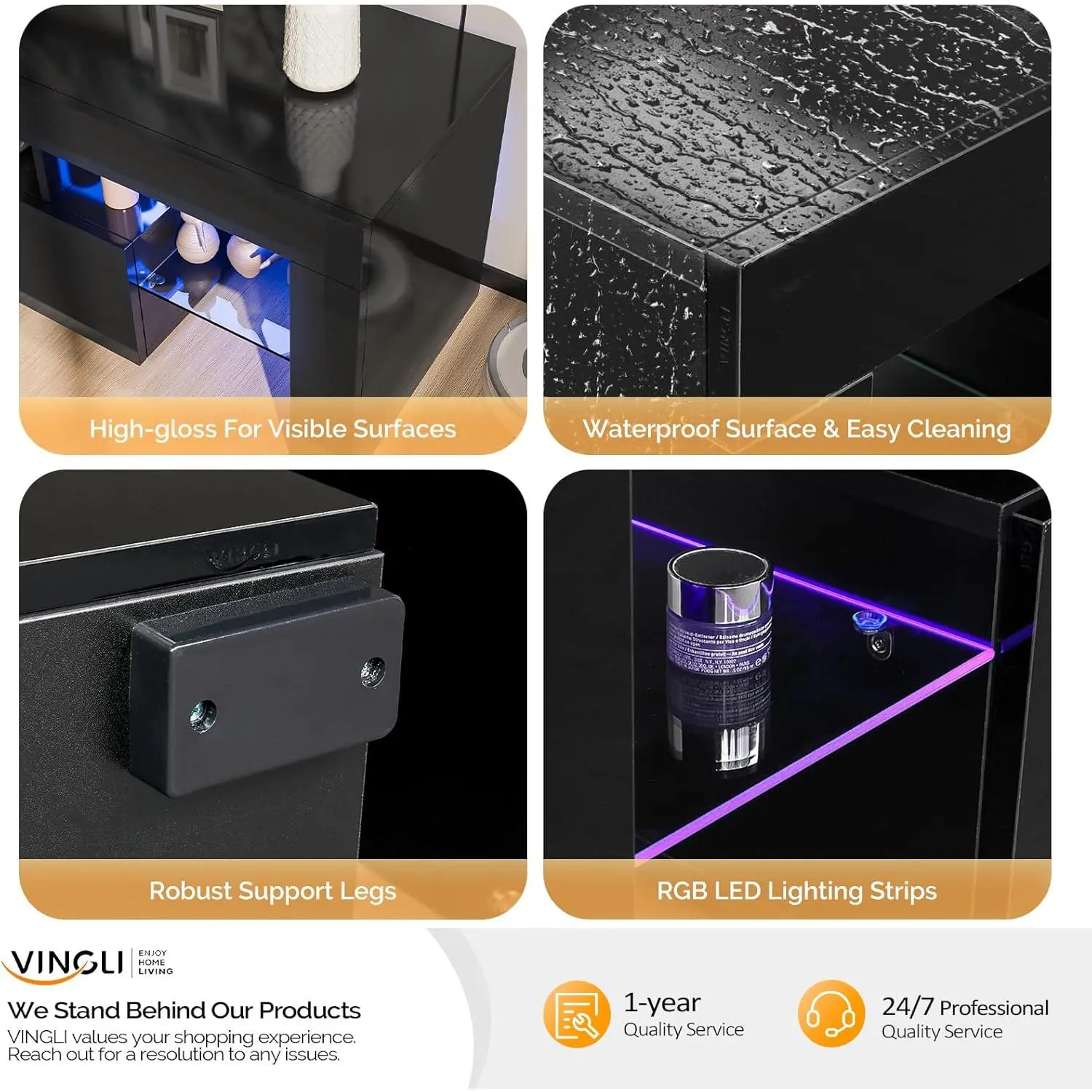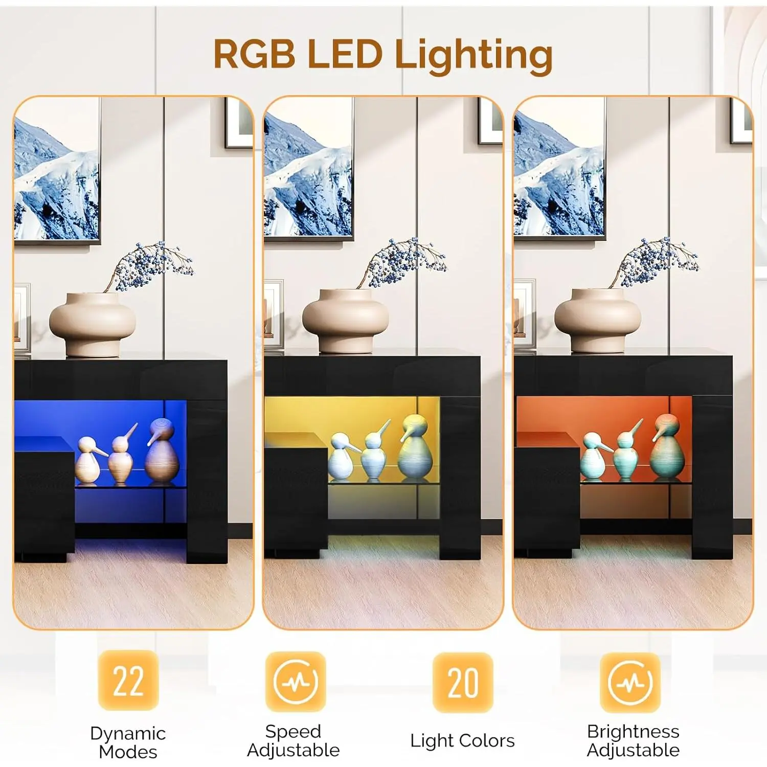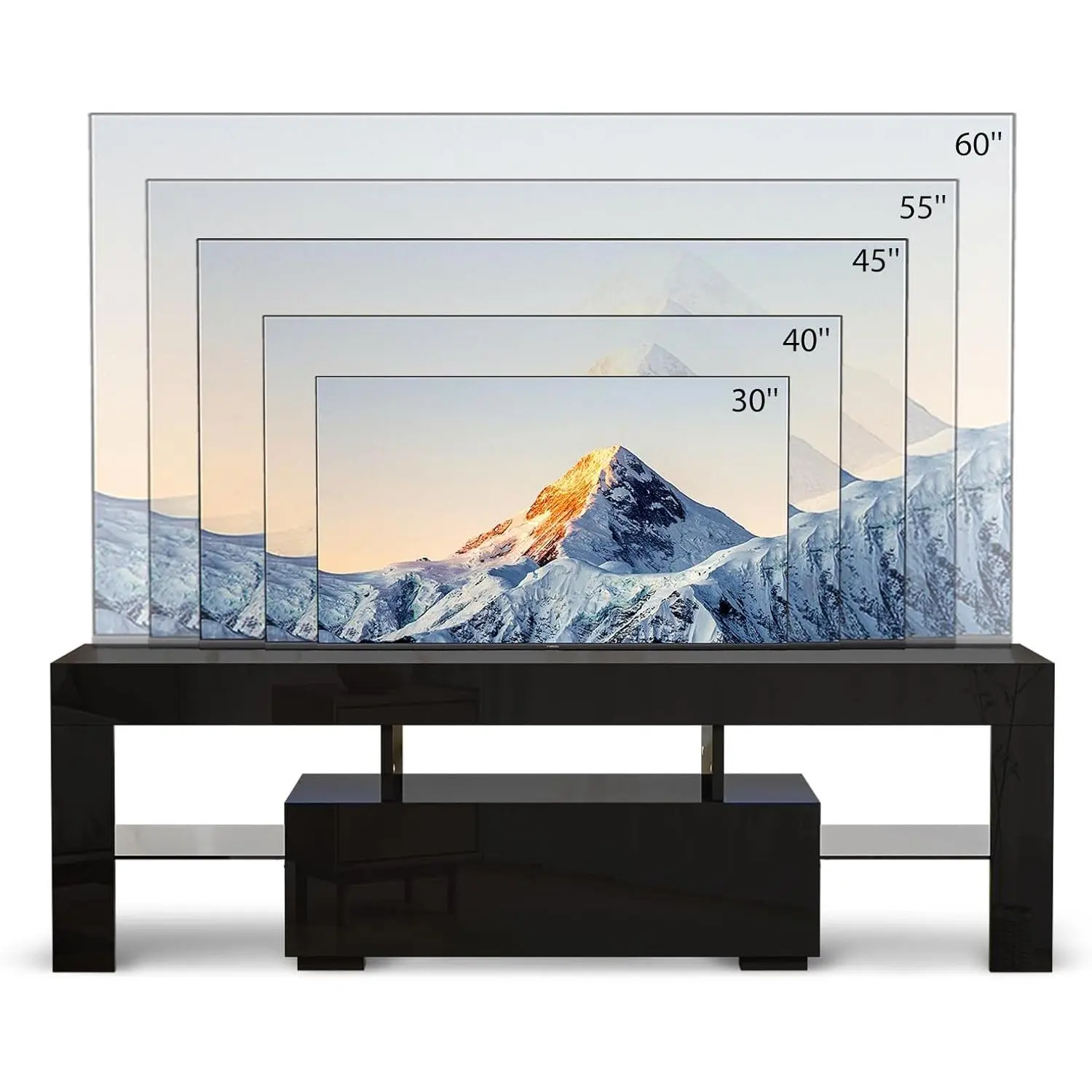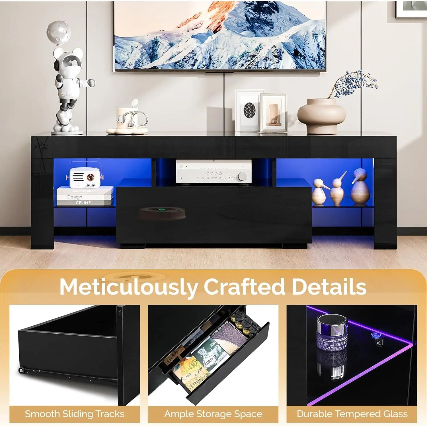 ·【Modern Design With LED Light】: The TV stand with the slick black design and glossy finish, features 2 glass shelves and the Blue LED lights system with ON/OFF switch control, right for your 65-inch TV screen. Cute blue lights, gives your room a good vibe and the lighting effect can be used as a night light.
